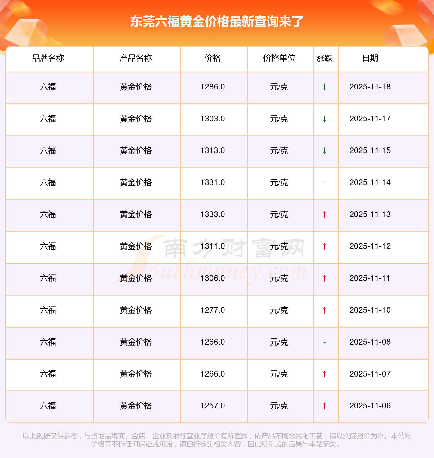 (2025年11月18日)东莞六福黄金价格现在为1286.0元/克。