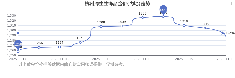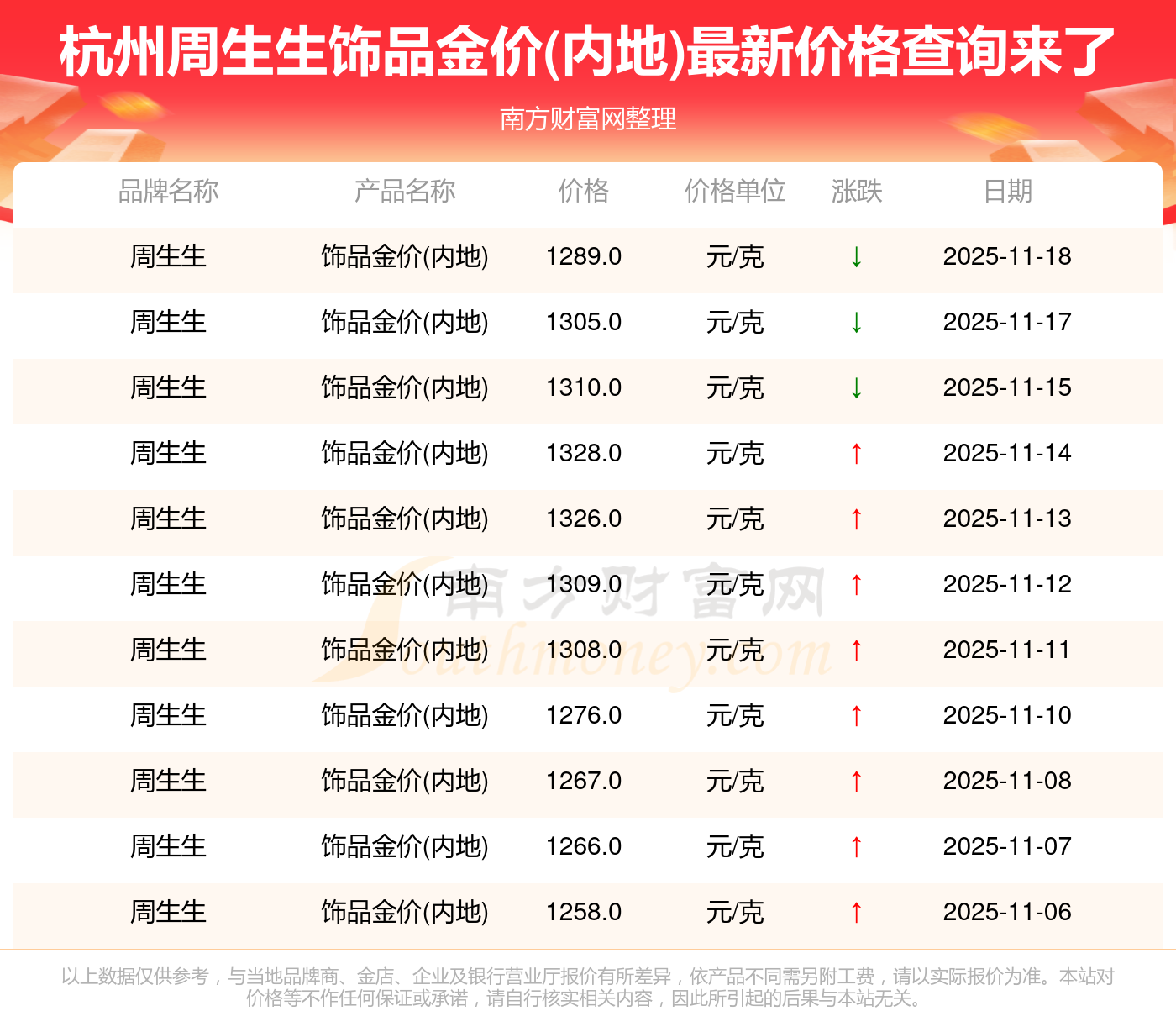 今日杭州周生生饰品金价(内地):1289.0元/克。