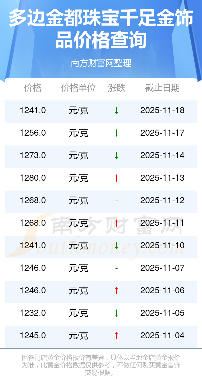 今日(2025年11月18日),多边金都珠宝千足金饰品最新价格为1241.0元/克。