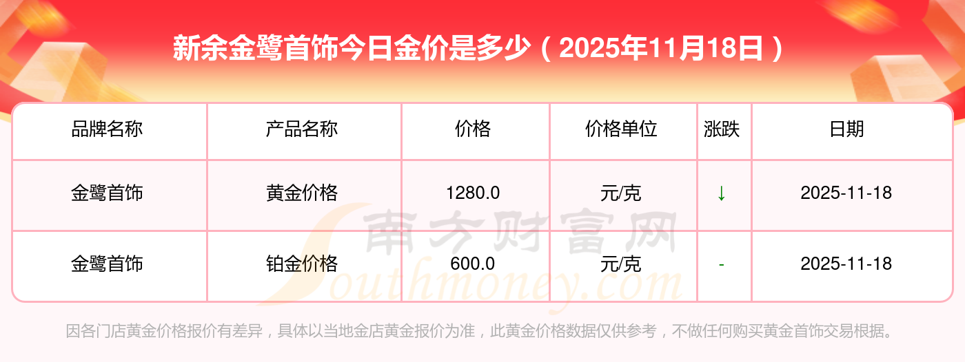 2025年11月18日新余金鹭首饰黄金的单价,一克为多少?黄金价格1288.0元/克,铂金价格626.0元/克,饰品金价(内地)1288.0元/克,黄金饰品(香港)44770.0,铂金价格(香港)17820.0,金条价格(香港)40390.0,金条金价(内地)1127.0元/克,黄金价格1285.0元/克,铂金价格600.0元/克,足金价格1285.0元/克,黄金价格1257.0元/克。