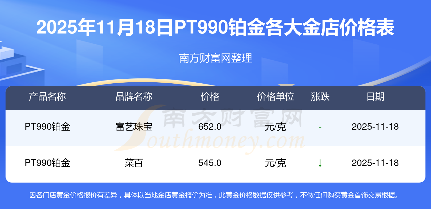 今天是2025年11月18日,周大福、周大福、周大福、周大福、周大福、周大福、周大福、老凤祥、老凤祥、老凤祥、周六福等各大金店品牌PT990铂金最新价格如下:周大福1288.0元/克、周大福626.0元/克、周大福1288.0元/克、周大福44770.0、周大福17820.0、周大福40390.0、周大福1127.0元/克、老凤祥1285.0元/克、老凤祥600.0元/克、老凤祥1285.0元/克、周六福1257.0元/克。