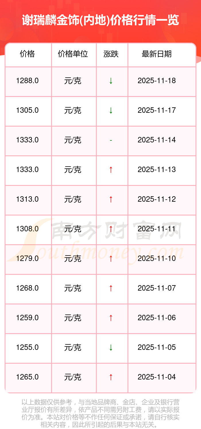 2025年11月18日谢瑞麟金饰(内地)价格是1288.0元/克。