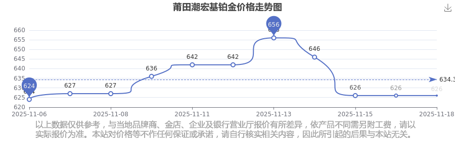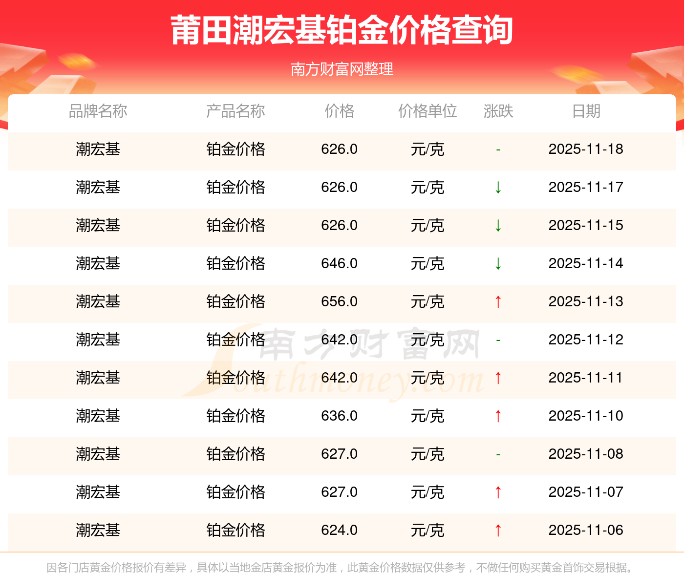 今日莆田潮宏基铂金价格的价格为626.0元/克。