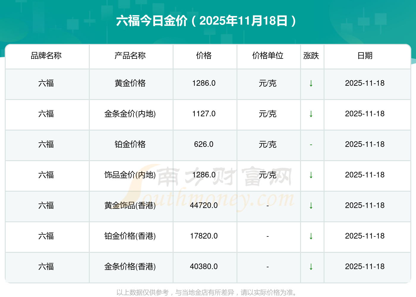 你了解六福金价今日价格吗?以下是详情数据:黄金价格1288.0元/克,铂金价格626.0元/克,饰品金价(内地)1288.0元/克,黄金饰品(香港)44770.0,铂金价格(香港)17820.0,金条价格(香港)40390.0,金条金价(内地)1127.0元/克,黄金价格1285.0元/克,铂金价格600.0元/克,足金价格1285.0元/克,黄金价格1257.0元/克。