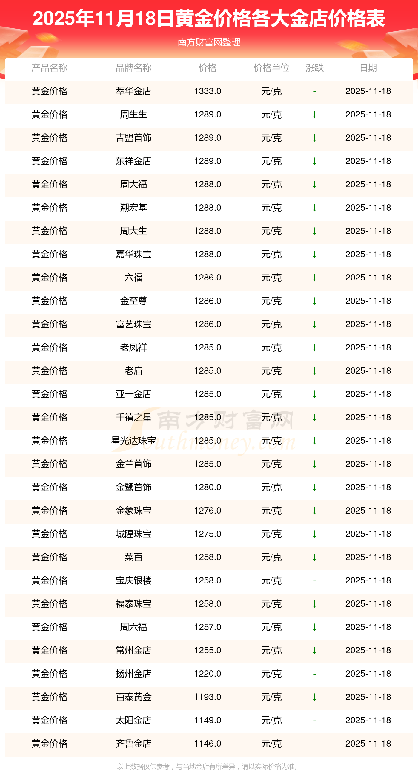 2025年11月18日各大金店黄金价格最新价格:周大福1288.0元/克,周大福626.0元/克,周大福1288.0元/克,周大福44770.0,周大福17820.0,周大福40390.0,周大福1127.0元/克,老凤祥1285.0元/克,老凤祥600.0元/克,老凤祥1285.0元/克,周六福1257.0元/克。