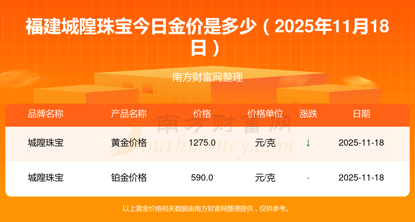 今日黄金价格是怎样的?当下黄金一克要卖多少钱?2025年11月18日福建城隍珠宝黄金按克计价,现在多少钱一克?黄金价格1288.0元/克,铂金价格626.0元/克,饰品金价(内地)1288.0元/克,黄金饰品(香港)44770.0,铂金价格(香港)17820.0,金条价格(香港)40390.0,金条金价(内地)1127.0元/克,黄金价格1285.0元/克,铂金价格600.0元/克,足金价格1285.0元/克,黄金价格1257.0元/克。