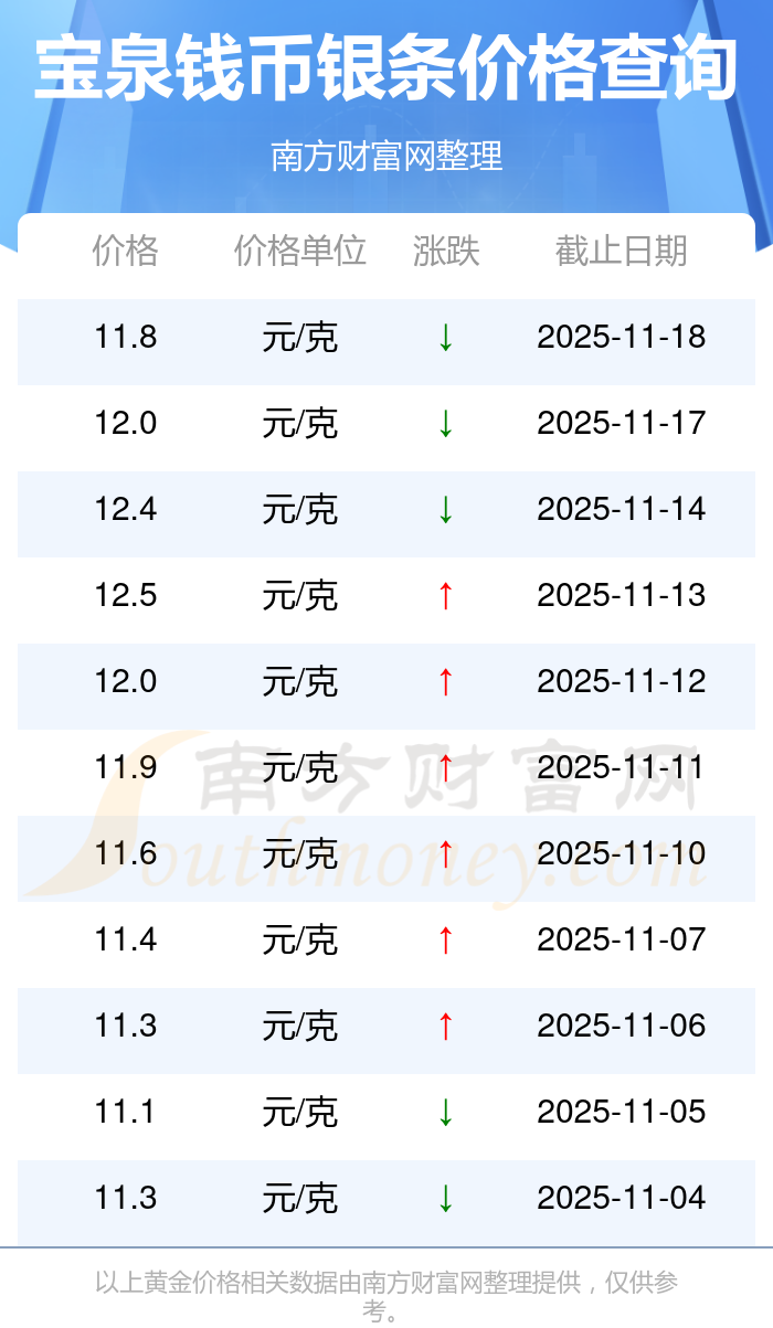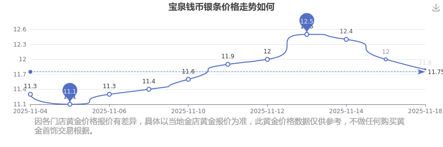 据了解,今日宝泉钱币 银条价格的最新价格为11.8元/克。