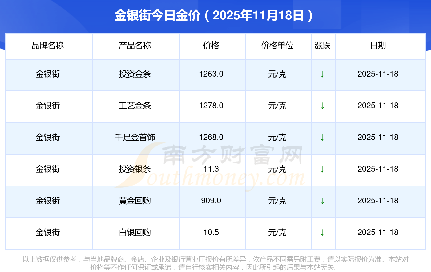 现在金银街黄金价格是多少钱1克_2025年金银街今日金价是多少钱一克,最新金银街查询,2025年11月18日金银街千足金首饰现在每克多少钱?最新金银街千足金首饰报价公布,一起来看看吧!