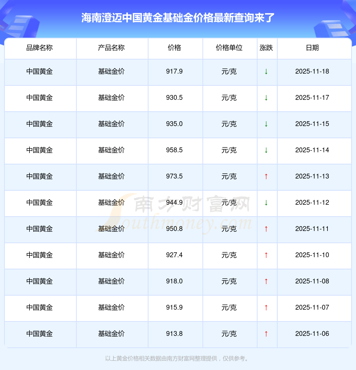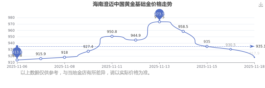于 2025年11月18日,海南澄迈中国黄金基础金价的克价为917.9元/克。