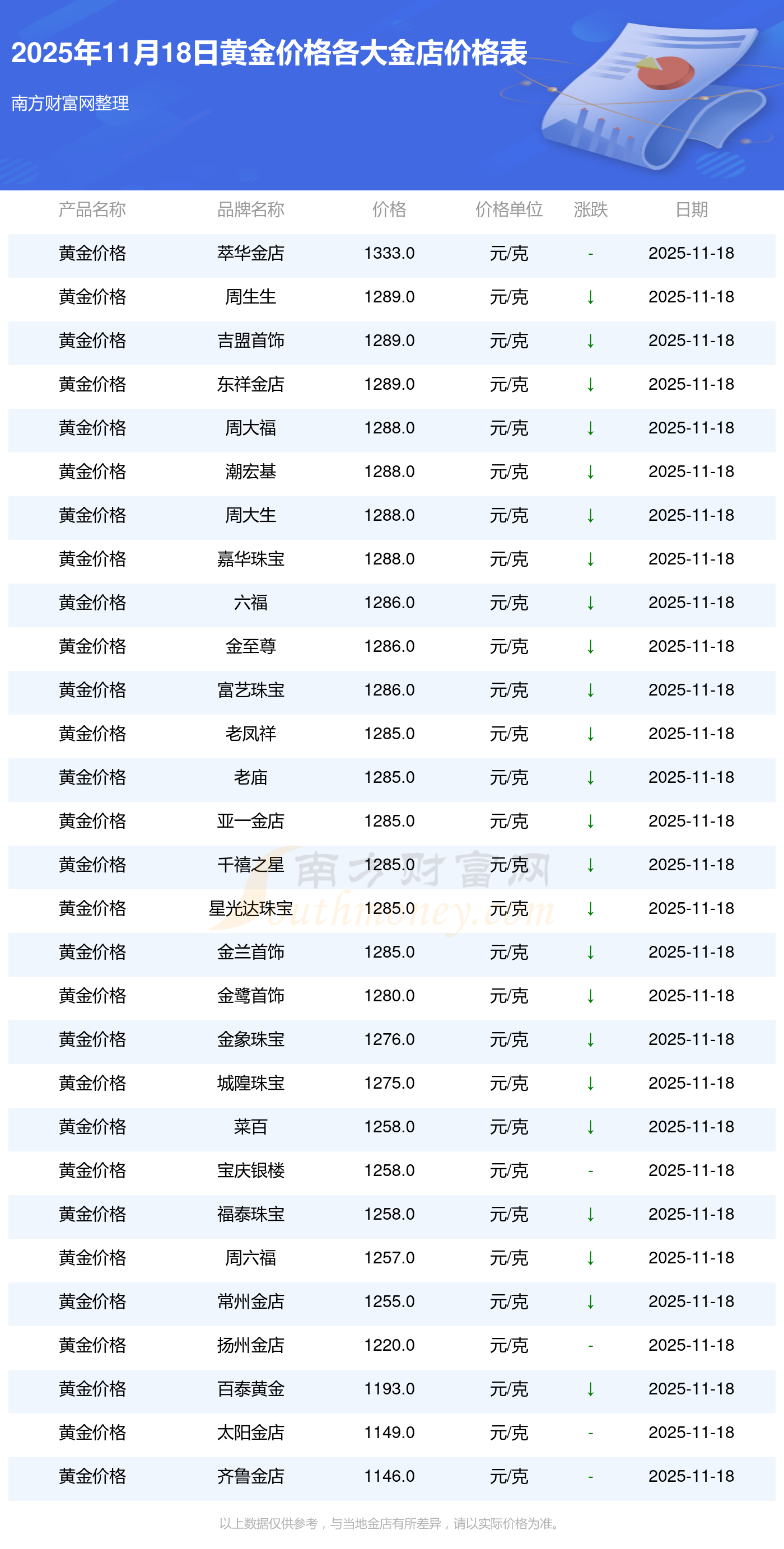 2025年11月18日各大金店黄金价格最新价格:周大福1288.0元/克,周大福626.0元/克,周大福1288.0元/克,周大福44770.0,周大福17820.0,周大福40390.0,周大福1127.0元/克,老凤祥1285.0元/克,老凤祥600.0元/克,老凤祥1285.0元/克,周六福1257.0元/克。