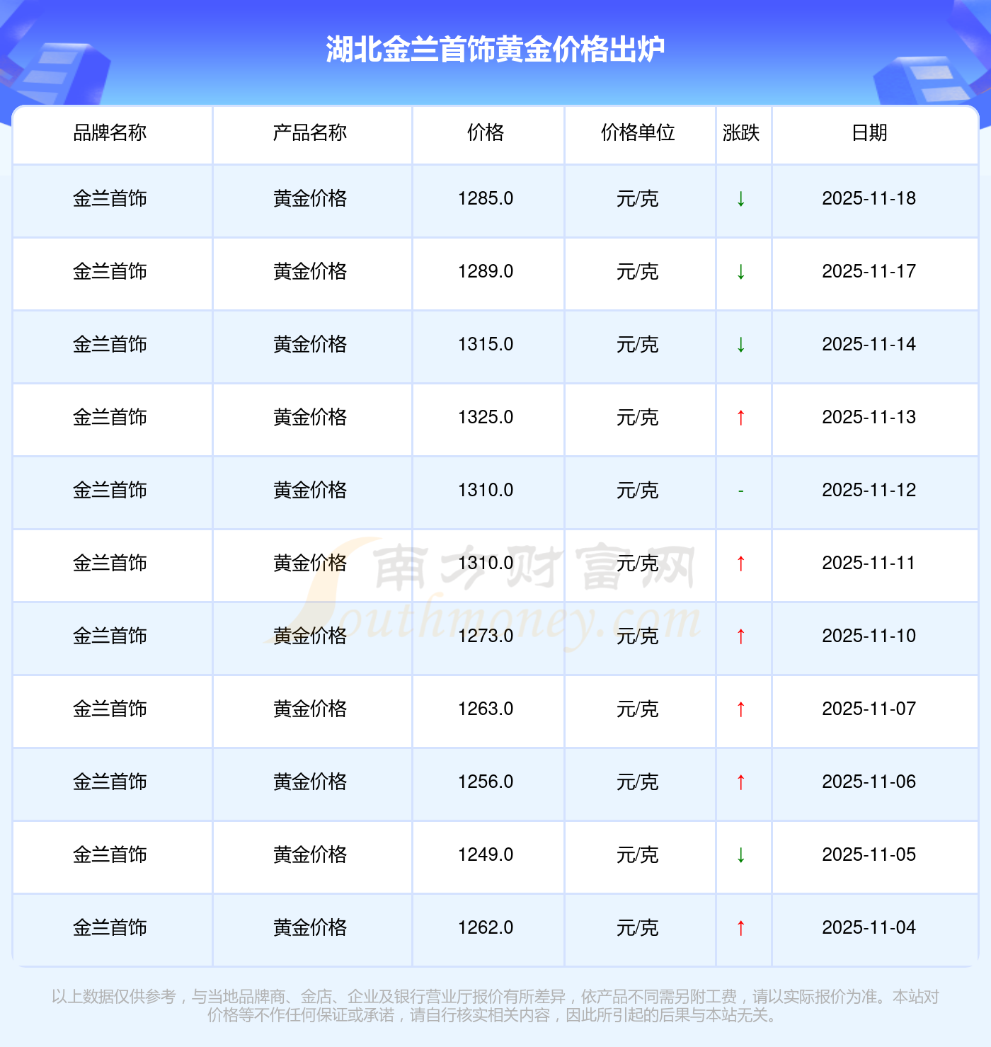 今日湖北金兰首饰黄金价格为1285.0元/克。