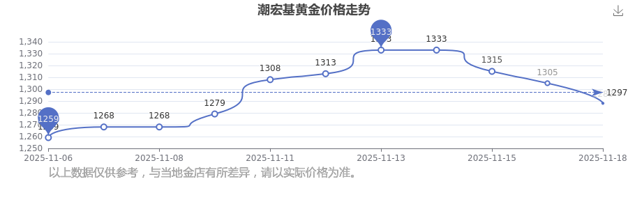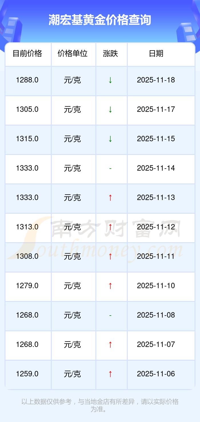 以上数据仅供参考,与当地品牌商、金店、企业及银行营业厅报价有所差异,依产品不同需另附工费,请以实际报价为准。本站对价格等不作任何保证或承诺,请自行核实相关内容,因此所引起的后果与本站无关。