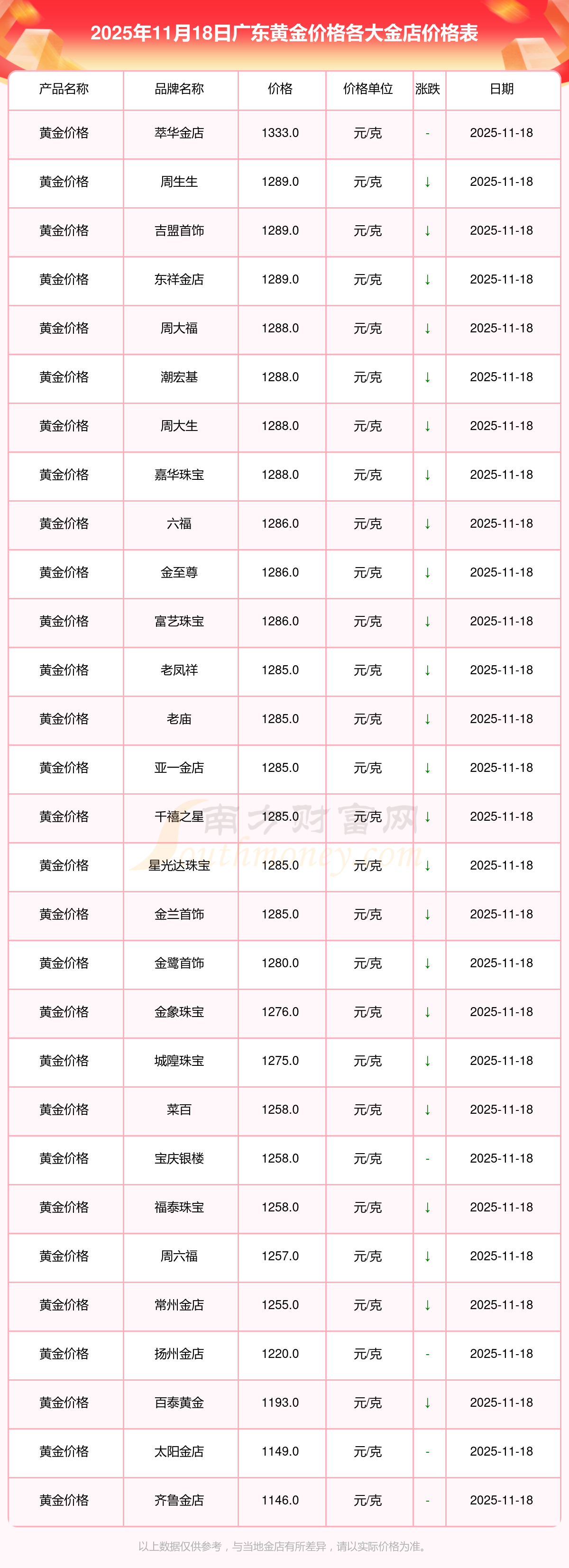 2025年11月18日广东周大福、周大福、周大福、周大福、周大福、周大福、周大福、老凤祥、老凤祥、老凤祥、周六福等各大金店品牌黄金价格最新价格行情来了,如下:周大福黄金价格1288.0元/克,周大福铂金价格626.0元/克,周大福饰品金价(内地)1288.0元/克,周大福黄金饰品(香港)44770.0,周大福铂金价格(香港)17820.0,周大福金条价格(香港)40390.0,周大福金条金价(内地)1127.0元/克,老凤祥黄金价格1285.0元/克,老凤祥铂金价格600.0元/克,老凤祥足金价格1285.0元/克,周六福黄金价格1257.0元/克。
