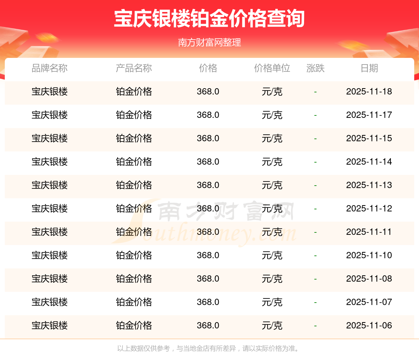 以上数据仅供参考,与当地品牌商、金店、企业及银行营业厅报价有所差异,依产品不同需另附工费,请以实际报价为准。本站对价格等不作任何保证或承诺,请自行核实相关内容,因此所引起的后果与本站无关。