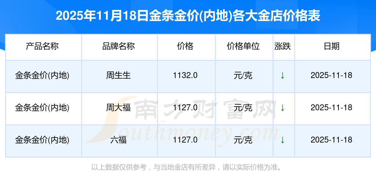 2025年11月18日,周大福、周大福、周大福、周大福、周大福、周大福、周大福、老凤祥、老凤祥、老凤祥、周六福等各大金店品牌金条金价(内地)今日价格如下:周大福1288.0元/克、周大福626.0元/克、周大福1288.0元/克、周大福44770.0、周大福17820.0、周大福40390.0、周大福1127.0元/克、老凤祥1285.0元/克、老凤祥600.0元/克、老凤祥1285.0元/克、周六福1257.0元/克。