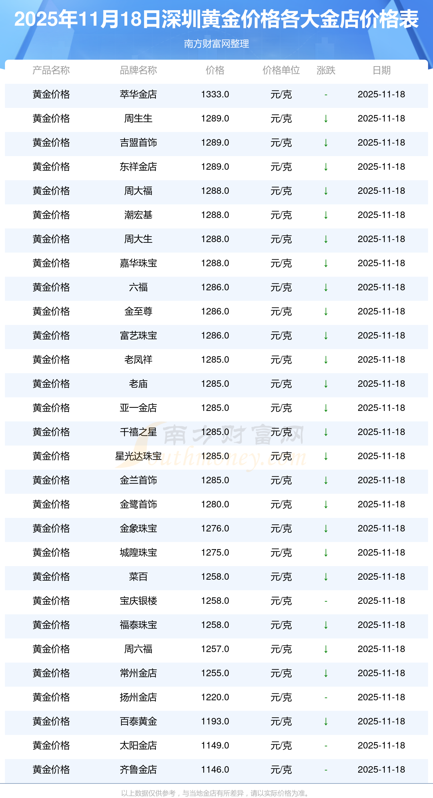 2025年11月18日深圳各大金店黄金价格最新价格查询来了:周大福1288.0元/克,周大福626.0元/克,周大福1288.0元/克,周大福44770.0,周大福17820.0,周大福40390.0,周大福1127.0元/克,老凤祥1285.0元/克,老凤祥600.0元/克,老凤祥1285.0元/克,周六福1257.0元/克。