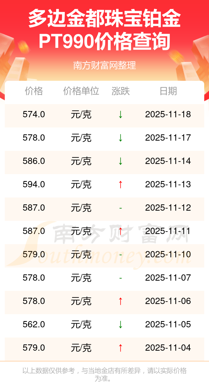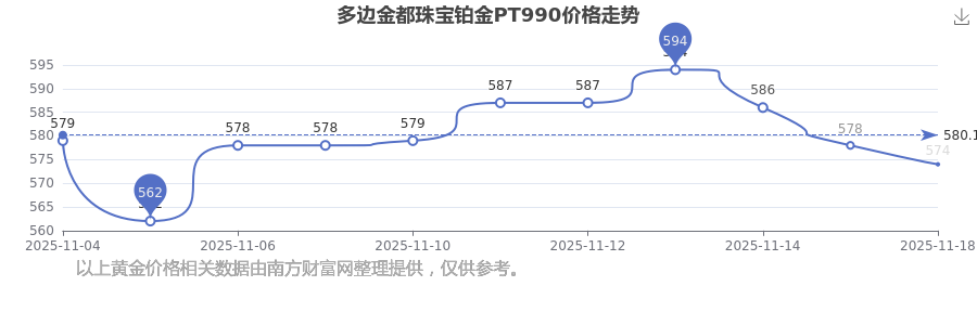 今日(2025年11月18日),多边金都珠宝铂金PT990最新价格是574.0元/克。