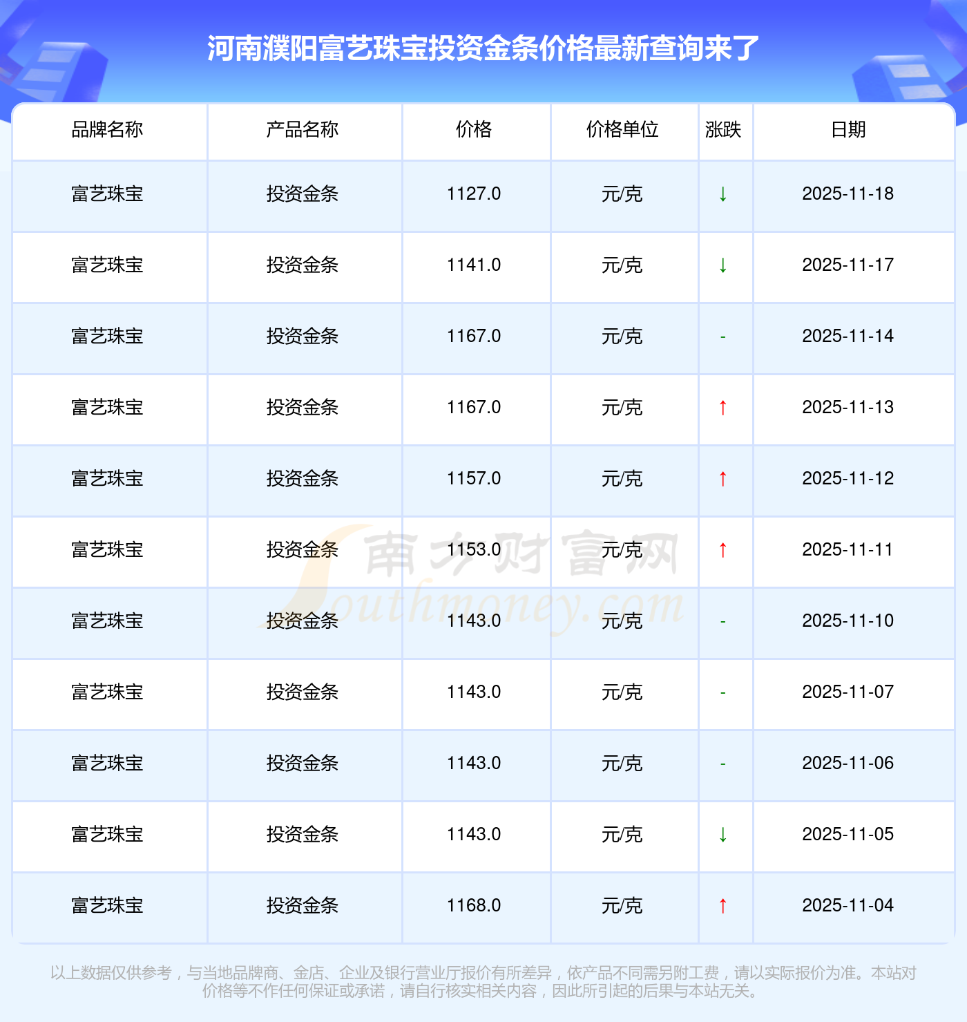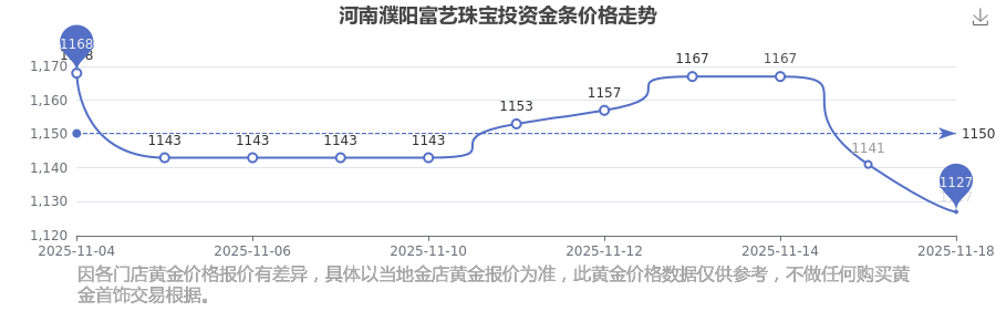 于 2025年11月18日,河南濮阳富艺珠宝投资金条的克价为1127.0元/克。