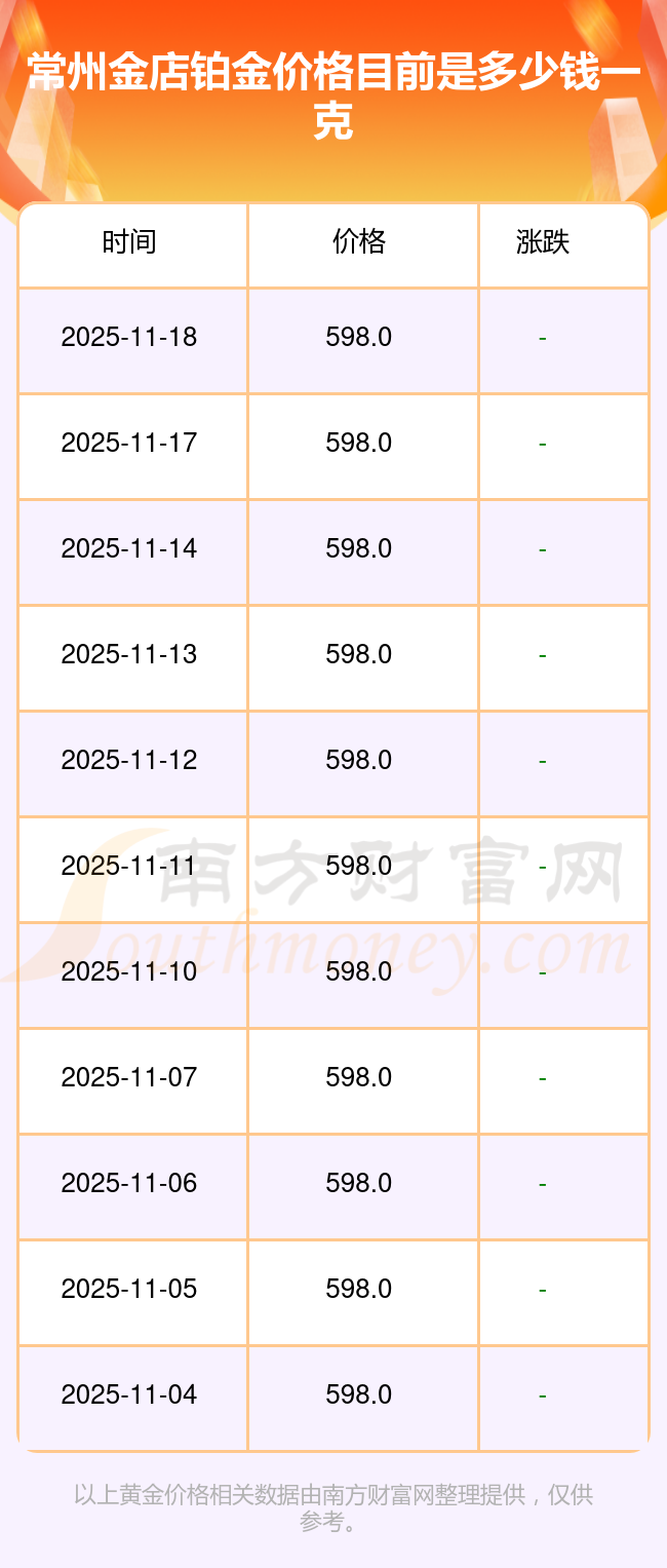 今日常州金店铂金价格是598.0元/克。