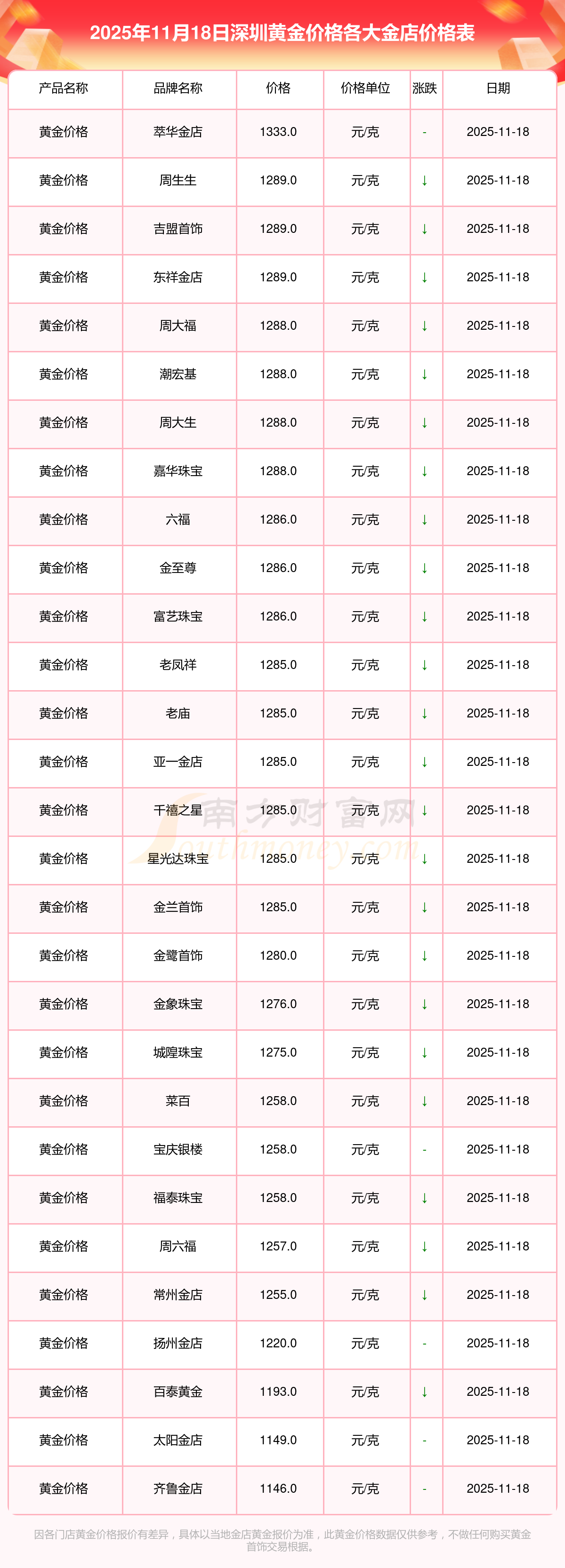 2025年11月18日深圳各大金店黄金价格最新价格查询来了:周大福1288.0元/克,周大福626.0元/克,周大福1288.0元/克,周大福44770.0,周大福17820.0,周大福40390.0,周大福1127.0元/克,老凤祥1285.0元/克,老凤祥600.0元/克,老凤祥1285.0元/克,周六福1257.0元/克。
