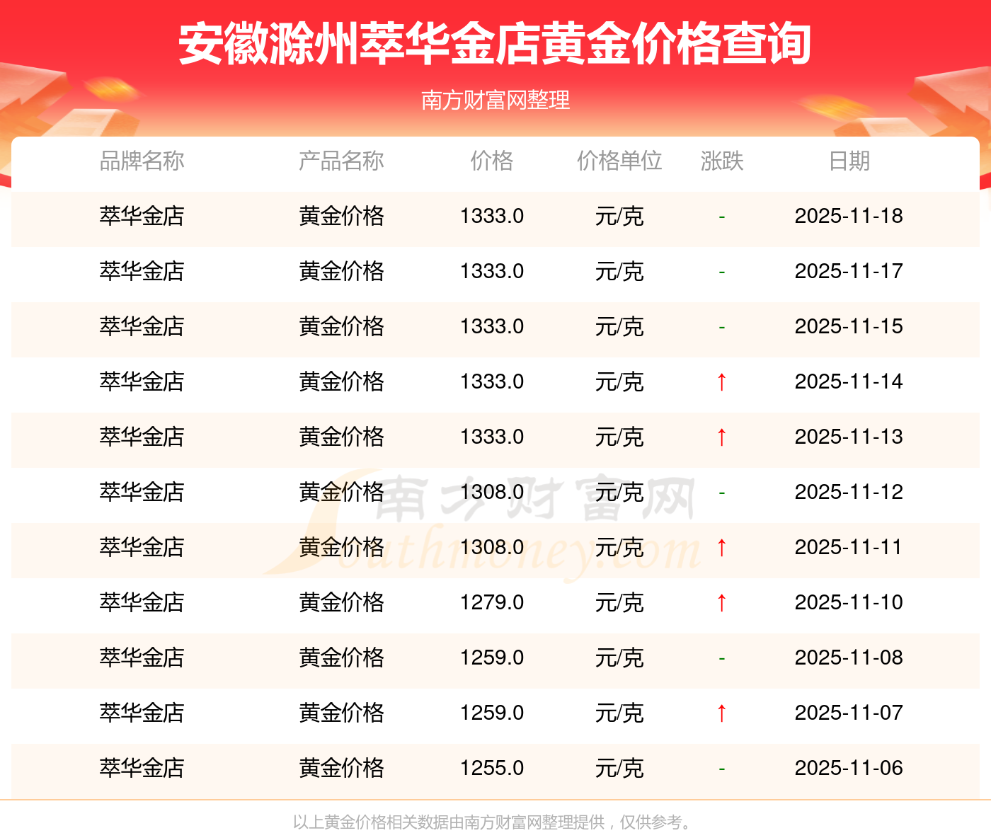 今日黄金价格报价最高的金店是萃华金店,为1333.0元/克,报价最低的金店是齐鲁金店,为1146.0元/克。今日黄金价格高低差为187元/克。