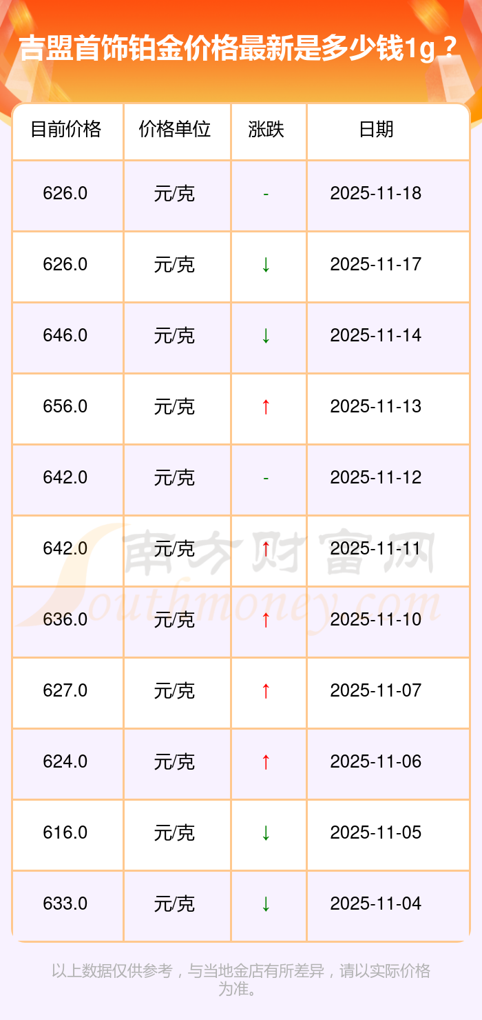 吉盟首饰今日 铂金价格的最新市场行情价为626.0元/克。