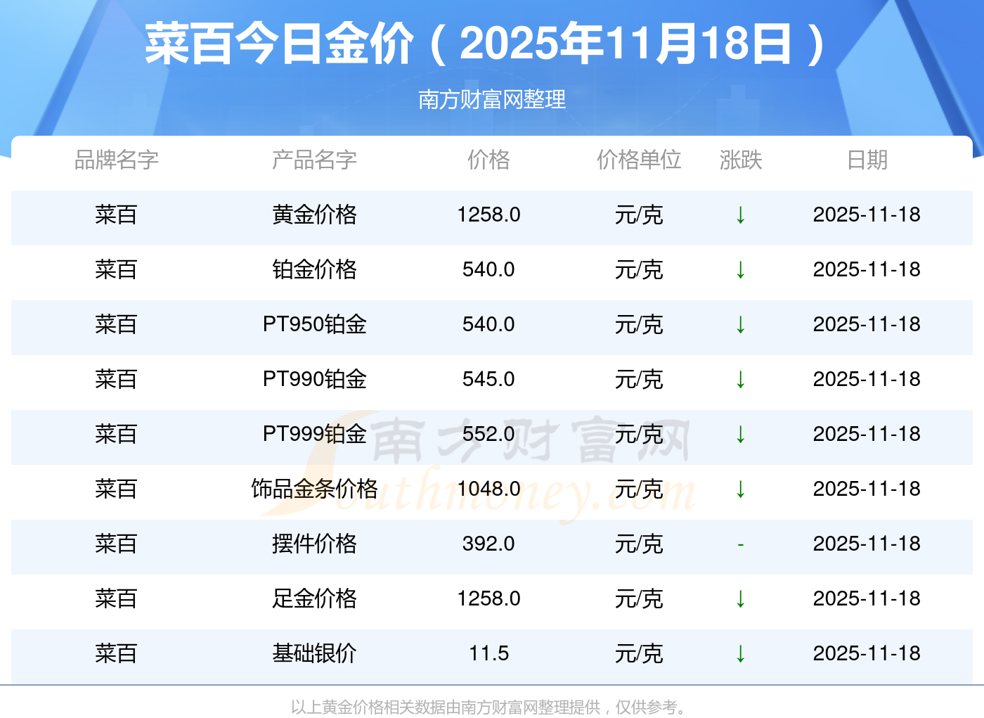 菜百金价今日价格:黄金价格1288.0元/克,铂金价格626.0元/克,饰品金价(内地)1288.0元/克,黄金饰品(香港)44770.0,铂金价格(香港)17820.0,金条价格(香港)40390.0,金条金价(内地)1127.0元/克,黄金价格1285.0元/克,铂金价格600.0元/克,足金价格1285.0元/克,黄金价格1257.0元/克。