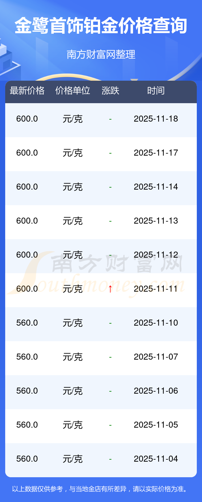 今日金鹭首饰铂金价格最新是600.0元/克。