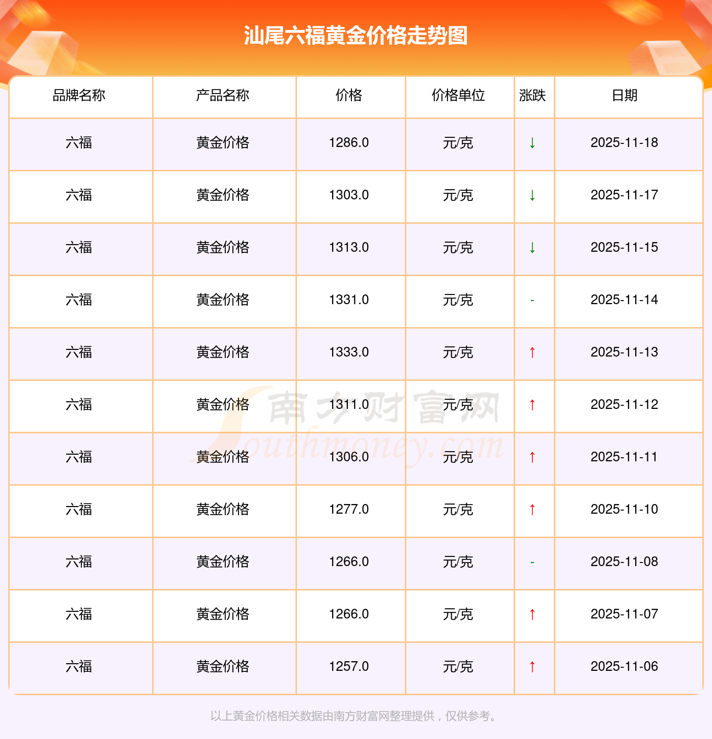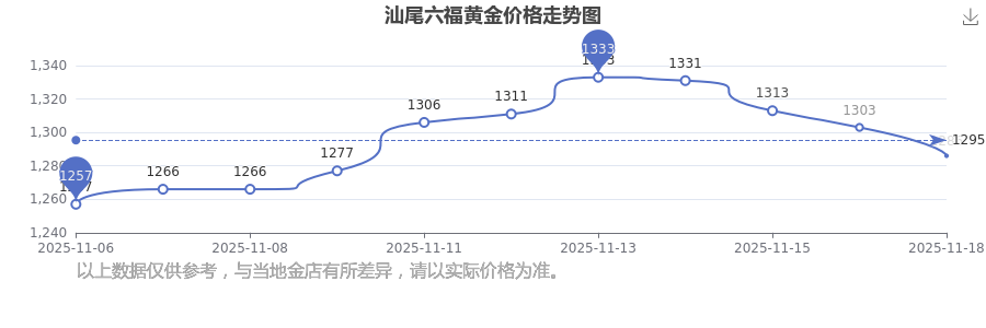 今日(2025年11月18日),汕尾六福黄金价格的价格是1286.0元/克。