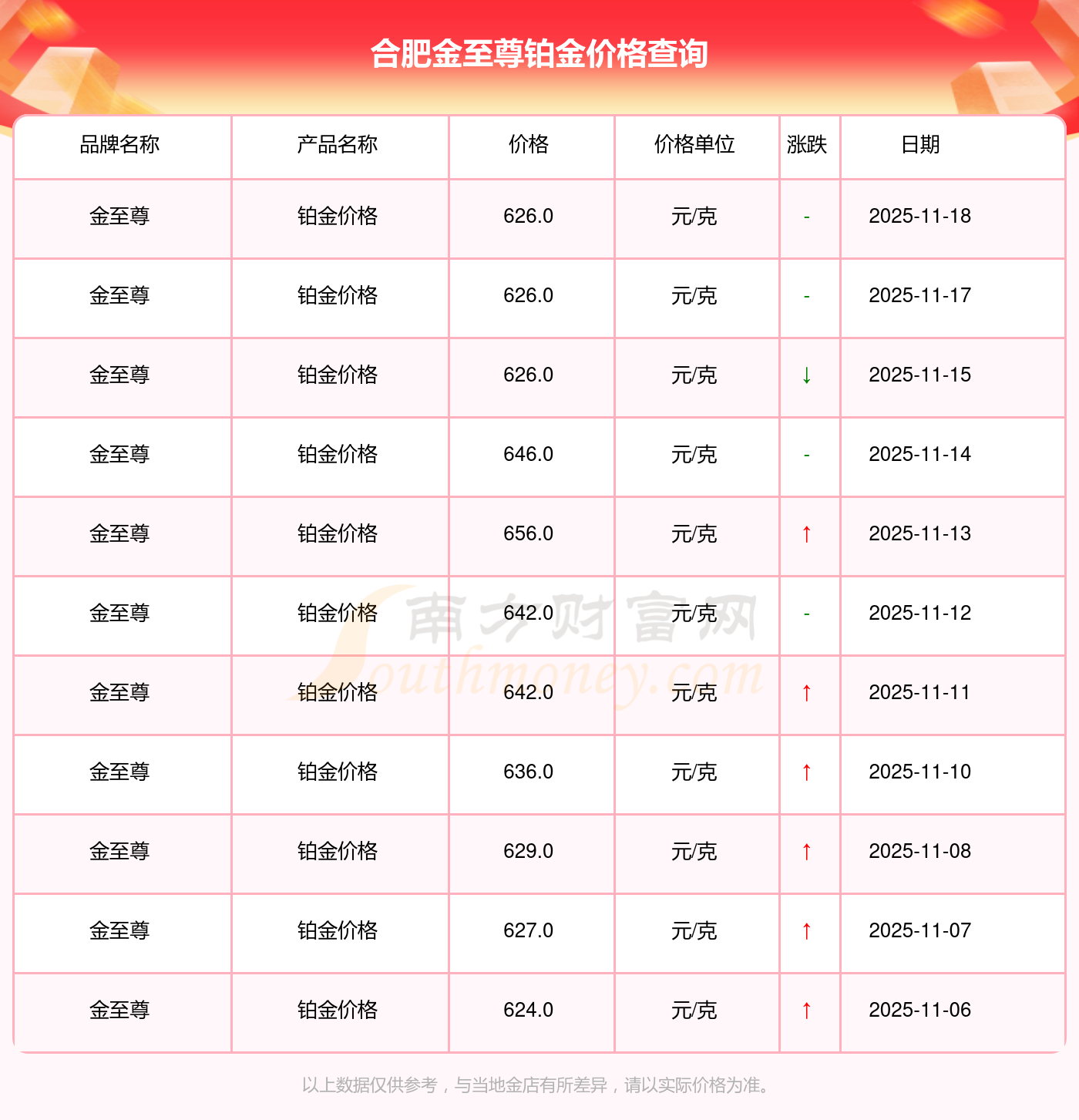 2025年11月18日合肥金至尊铂金价格为626.0元/克。
