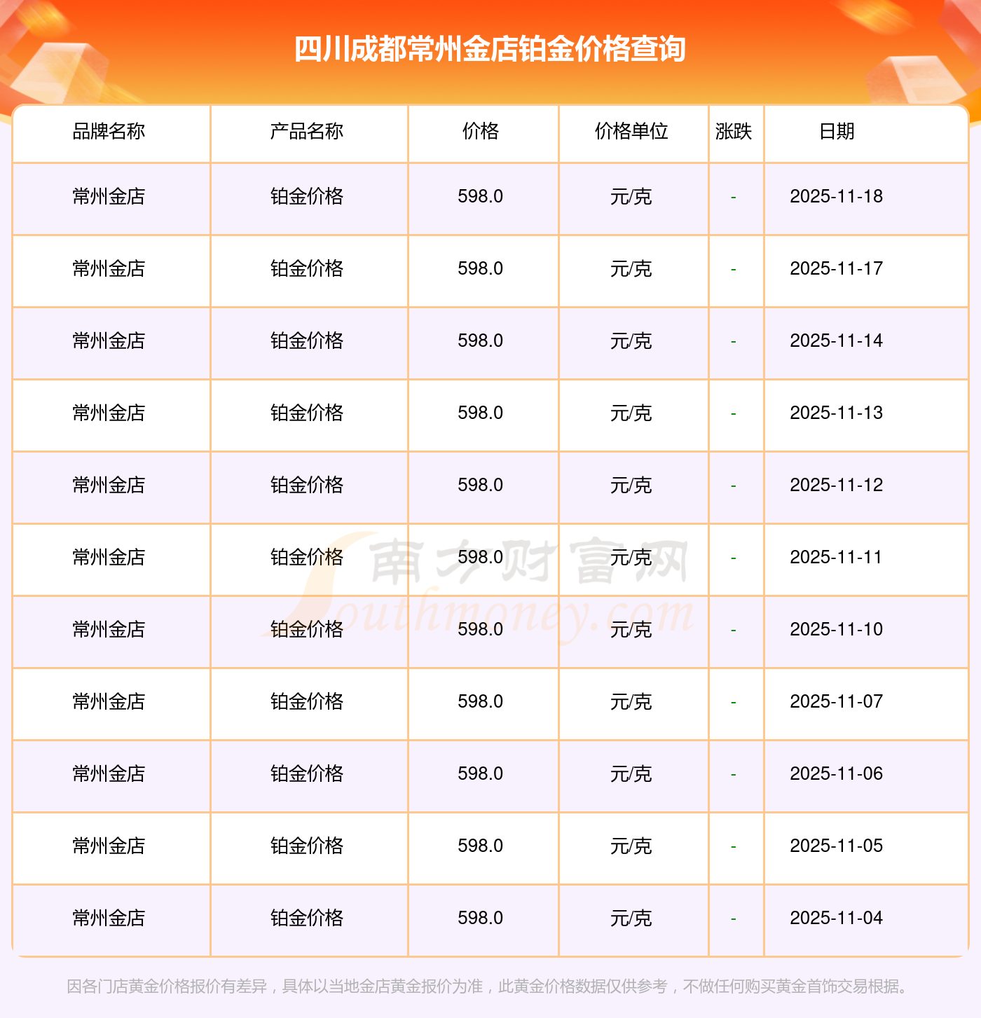 今天是2025年11月18日,周大福、周大福、周大福、周大福、周大福、周大福、周大福、老凤祥、老凤祥、老凤祥、周六福等各大金店品牌铂金价格最新价格如下:周大福1288.0元/克、周大福626.0元/克、周大福1288.0元/克、周大福44770.0、周大福17820.0、周大福40390.0、周大福1127.0元/克、老凤祥1285.0元/克、老凤祥600.0元/克、老凤祥1285.0元/克、周六福1257.0元/克。