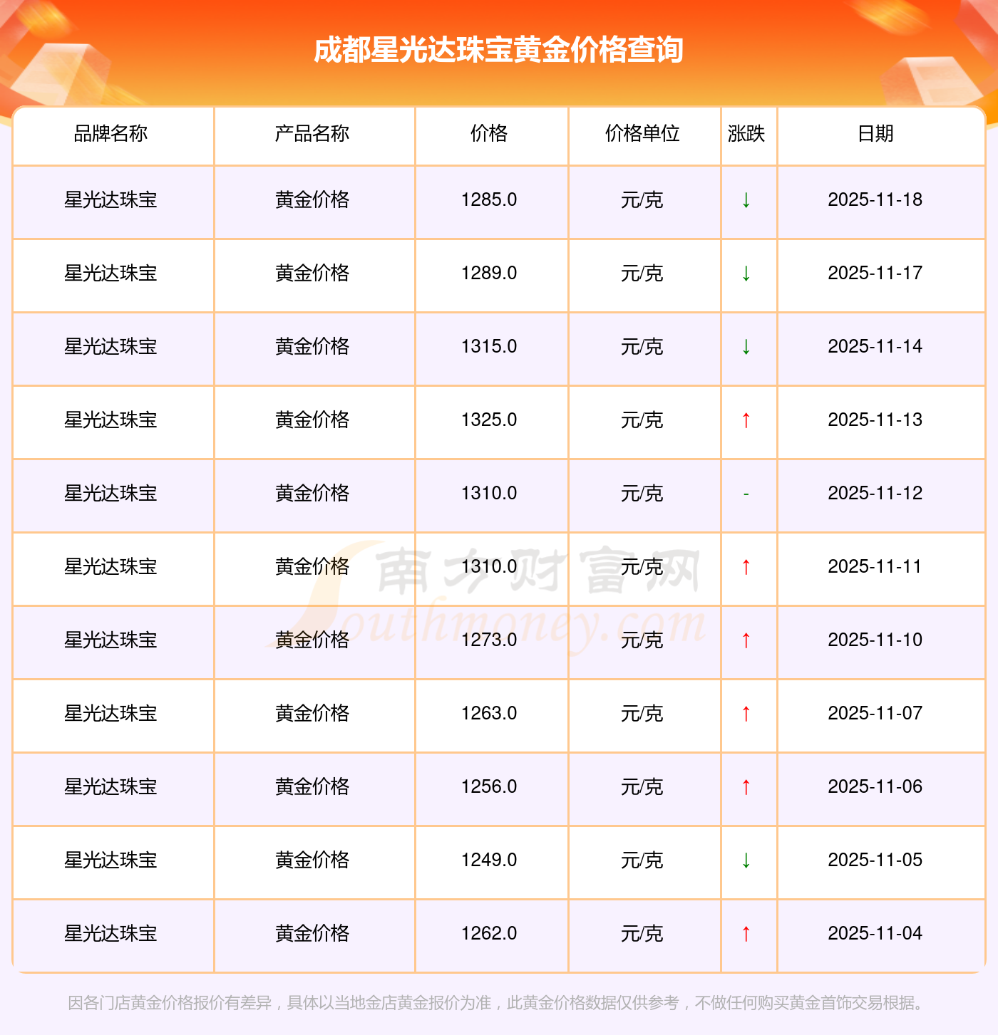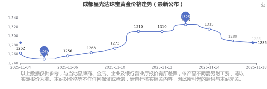 今日(2025年11月18日),成都星光达珠宝黄金价格的价格是1285.0元/克。