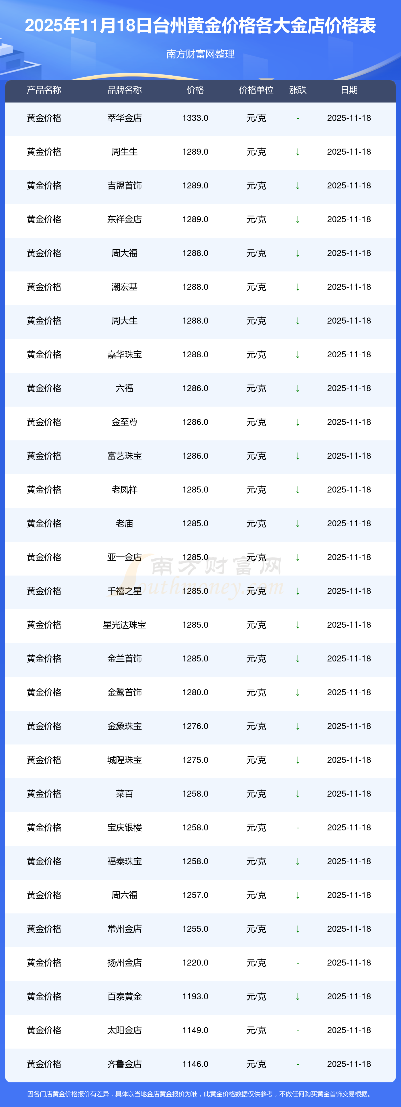 2025年11月18日台州周大福、周大福、周大福、周大福、周大福、周大福、周大福、老凤祥、老凤祥、老凤祥、周六福等各大金店品牌黄金价格最新价格如下:周大福黄金价格1288.0元/克,周大福铂金价格626.0元/克,周大福饰品金价(内地)1288.0元/克,周大福黄金饰品(香港)44770.0,周大福铂金价格(香港)17820.0,周大福金条价格(香港)40390.0,周大福金条金价(内地)1127.0元/克,老凤祥黄金价格1285.0元/克,老凤祥铂金价格600.0元/克,老凤祥足金价格1285.0元/克,周六福黄金价格1257.0元/克。