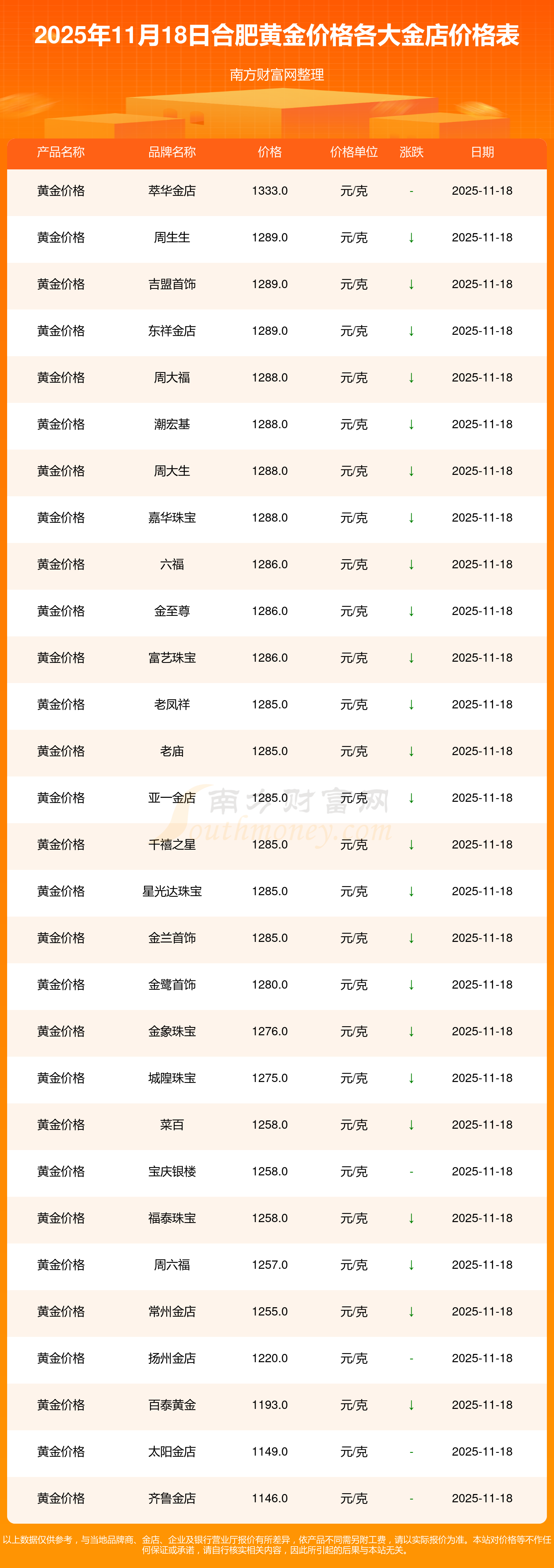 2025年11月18日合肥各大金店黄金价格最新价格查询来了:周大福1288.0元/克,周大福626.0元/克,周大福1288.0元/克,周大福44770.0,周大福17820.0,周大福40390.0,周大福1127.0元/克,老凤祥1285.0元/克,老凤祥600.0元/克,老凤祥1285.0元/克,周六福1257.0元/克。