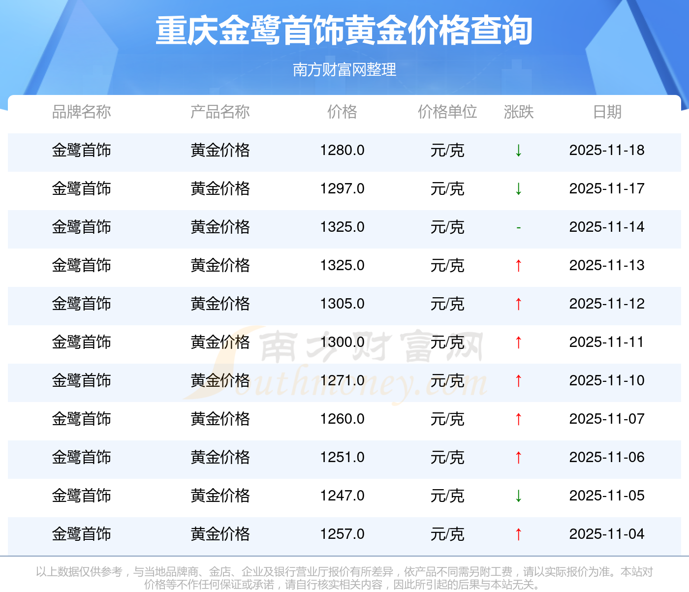 2025年11月18日周大福、周大福、周大福、周大福、周大福、周大福、周大福、老凤祥、老凤祥、老凤祥、周六福等各大金店品牌黄金价格最新价格如下:周大福黄金价格1288.0元/克,周大福铂金价格626.0元/克,周大福饰品金价(内地)1288.0元/克,周大福黄金饰品(香港)44770.0,周大福铂金价格(香港)17820.0,周大福金条价格(香港)40390.0,周大福金条金价(内地)1127.0元/克,老凤祥黄金价格1285.0元/克,老凤祥铂金价格600.0元/克,老凤祥足金价格1285.0元/克,周六福黄金价格1257.0元/克。