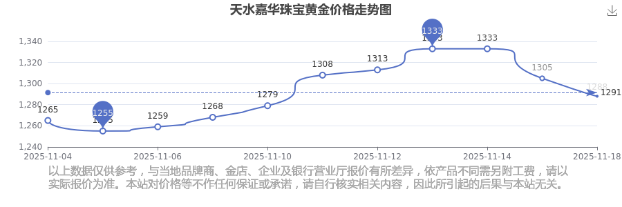 2025年11月18日,天水嘉华珠宝黄金价格每克的售卖价位为1288.0元/克。