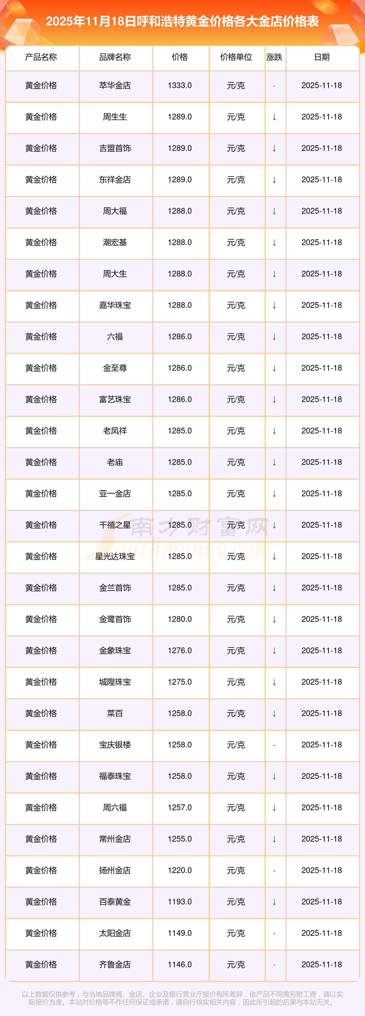 2025年11月18日,呼和浩特周大福、周大福、周大福、周大福、周大福、周大福、周大福、老凤祥、老凤祥、老凤祥、周六福等各大金店品牌黄金价格今日价格行情最新来了:周大福1288.0元/克、周大福626.0元/克、周大福1288.0元/克、周大福44770.0、周大福17820.0、周大福40390.0、周大福1127.0元/克、老凤祥1285.0元/克、老凤祥600.0元/克、老凤祥1285.0元/克、周六福1257.0元/克。