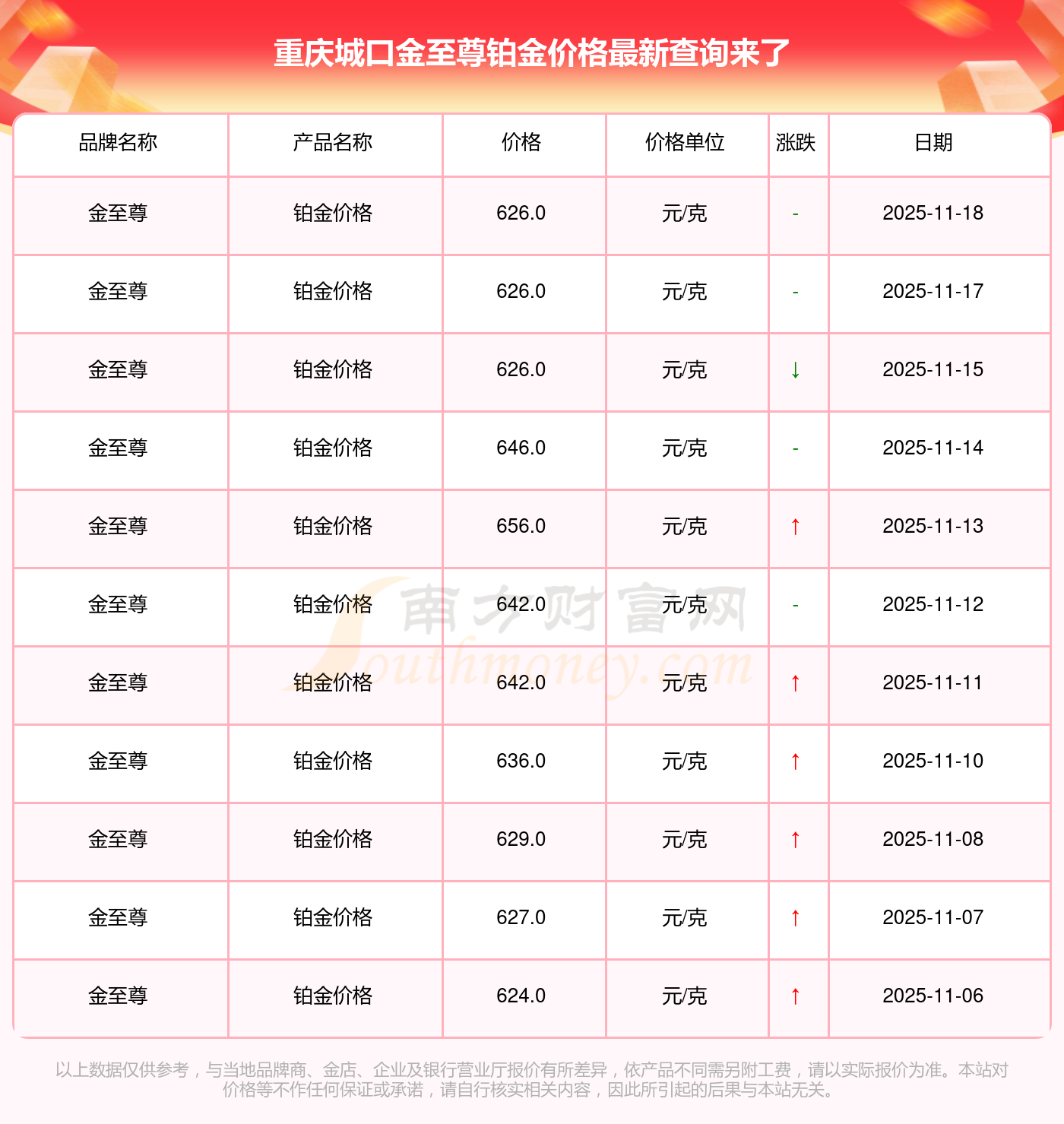 2025年11月18日,周大福、周大福、周大福、周大福、周大福、周大福、周大福、老凤祥、老凤祥、老凤祥、周六福等各大金店品牌铂金价格今日价格如下:周大福1288.0元/克、周大福626.0元/克、周大福1288.0元/克、周大福44770.0、周大福17820.0、周大福40390.0、周大福1127.0元/克、老凤祥1285.0元/克、老凤祥600.0元/克、老凤祥1285.0元/克、周六福1257.0元/克。