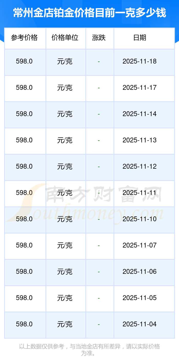 目前常州金店 铂金价格的价格,今日最新为598.0元/克。