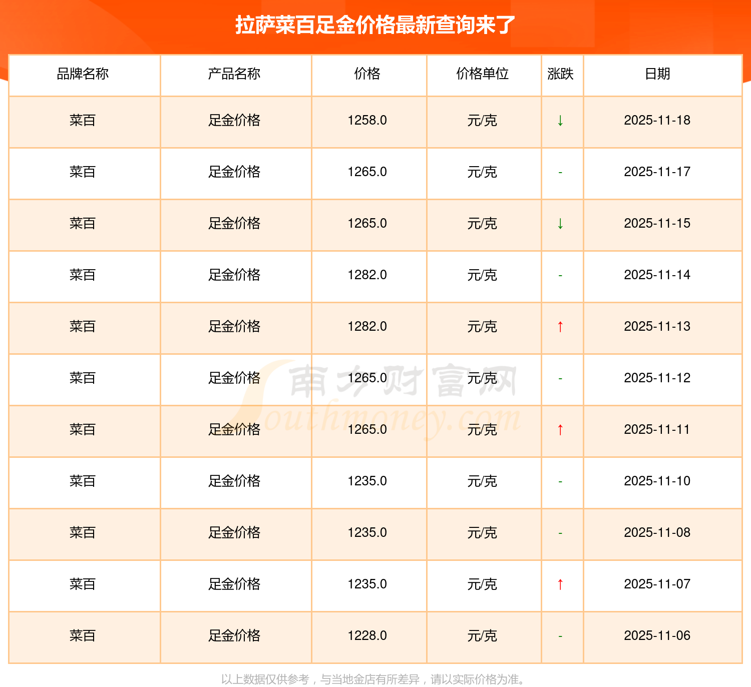 2025年11月18日周大福、周大福、周大福、周大福、周大福、周大福、周大福、老凤祥、老凤祥、老凤祥、周六福等各大金店品牌足金价格最新价格如下:周大福黄金价格1288.0元/克,周大福铂金价格626.0元/克,周大福饰品金价(内地)1288.0元/克,周大福黄金饰品(香港)44770.0,周大福铂金价格(香港)17820.0,周大福金条价格(香港)40390.0,周大福金条金价(内地)1127.0元/克,老凤祥黄金价格1285.0元/克,老凤祥铂金价格600.0元/克,老凤祥足金价格1285.0元/克,周六福黄金价格1257.0元/克。