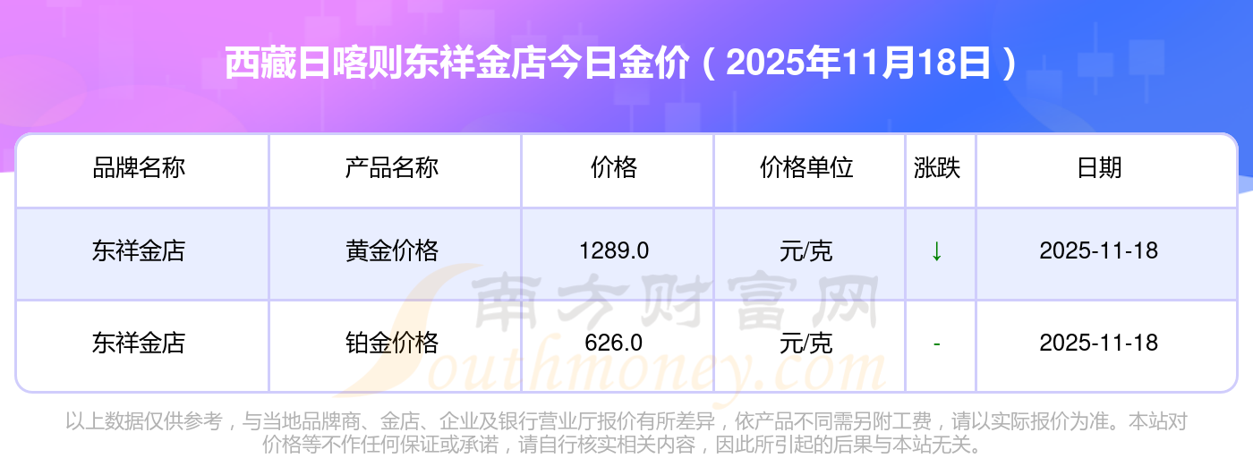 2025年11月18日西藏日喀则东祥金店最新价格:黄金价格1288.0元/克,铂金价格626.0元/克,饰品金价(内地)1288.0元/克,黄金饰品(香港)44770.0,铂金价格(香港)17820.0,金条价格(香港)40390.0,金条金价(内地)1127.0元/克,黄金价格1285.0元/克,铂金价格600.0元/克,足金价格1285.0元/克,黄金价格1257.0元/克。
