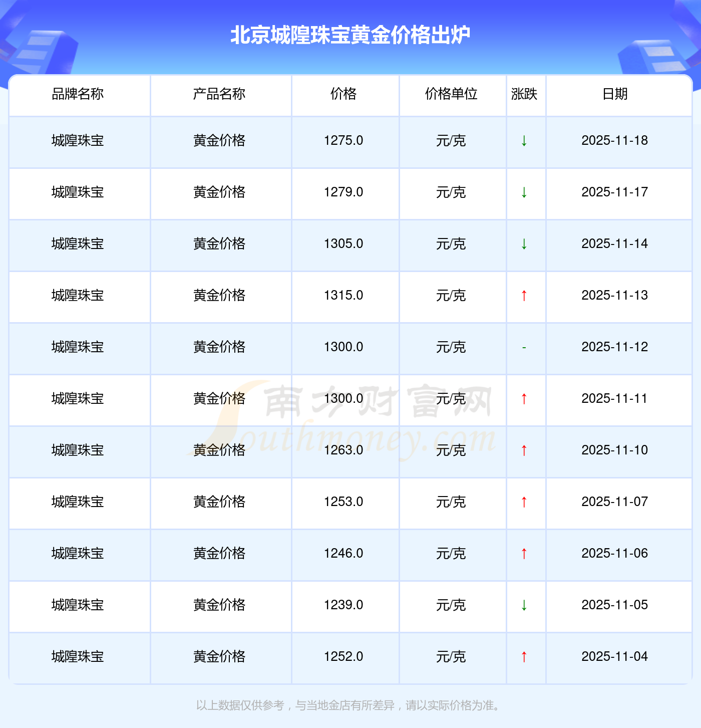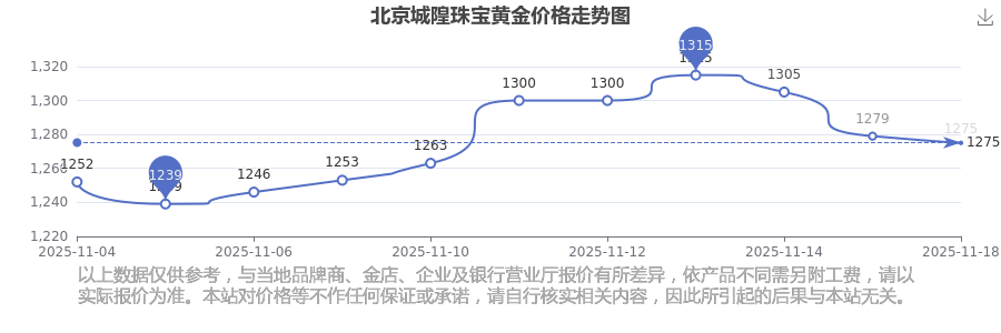 北京城隍珠宝 2025年11月18日的黄金价格价位为 1275.0元/克。