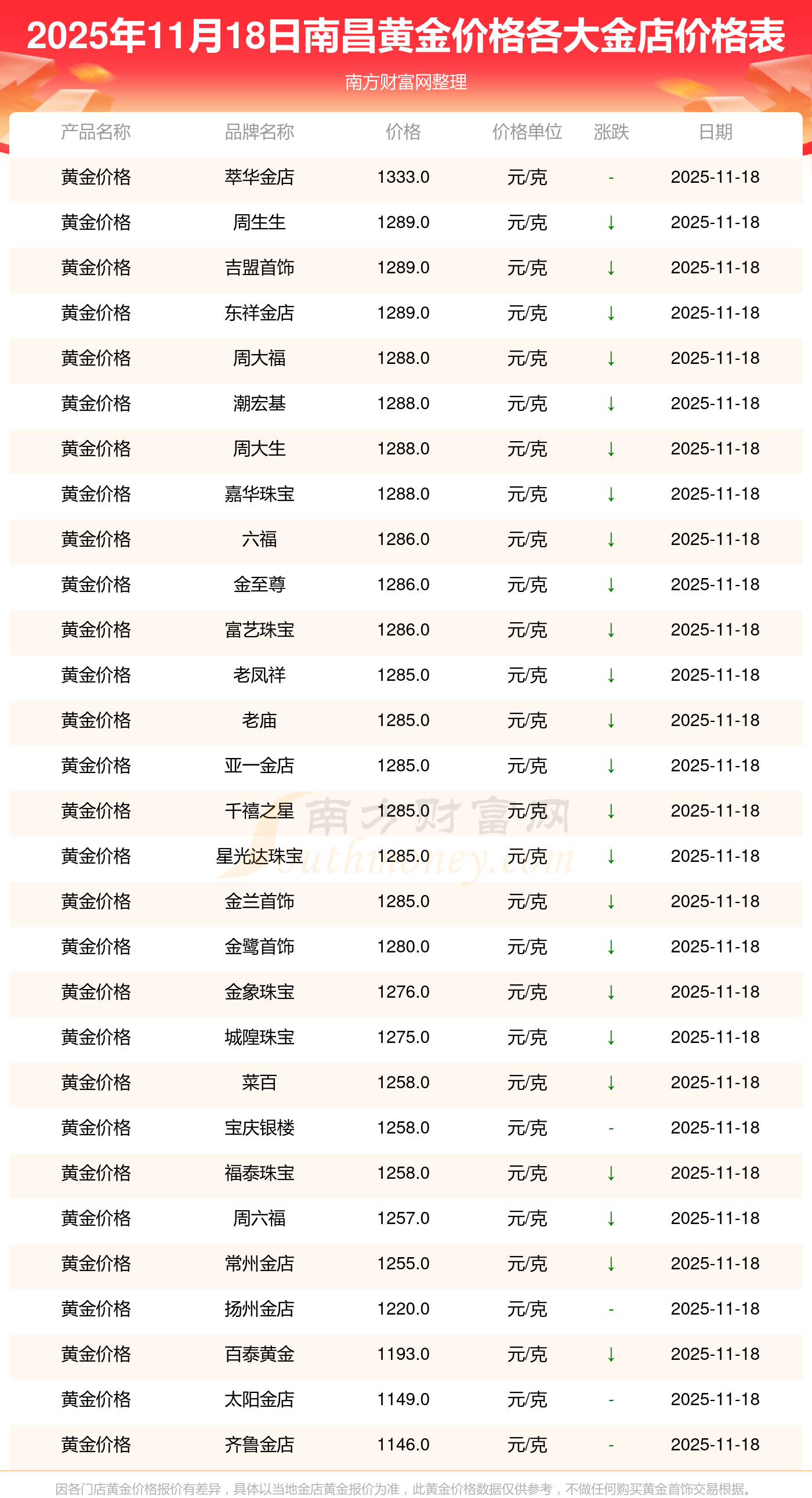 2025年11月18日,南昌周大福、周大福、周大福、周大福、周大福、周大福、周大福、老凤祥、老凤祥、老凤祥、周六福等各大金店品牌黄金价格今日价格如下:周大福1288.0元/克、周大福626.0元/克、周大福1288.0元/克、周大福44770.0、周大福17820.0、周大福40390.0、周大福1127.0元/克、老凤祥1285.0元/克、老凤祥600.0元/克、老凤祥1285.0元/克、周六福1257.0元/克。