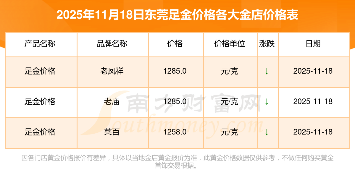2025年11月18日东莞周大福、周大福、周大福、周大福、周大福、周大福、周大福、老凤祥、老凤祥、老凤祥、周六福等各大金店品牌足金价格最新价格行情来了,如下:周大福黄金价格1288.0元/克,周大福铂金价格626.0元/克,周大福饰品金价(内地)1288.0元/克,周大福黄金饰品(香港)44770.0,周大福铂金价格(香港)17820.0,周大福金条价格(香港)40390.0,周大福金条金价(内地)1127.0元/克,老凤祥黄金价格1285.0元/克,老凤祥铂金价格600.0元/克,老凤祥足金价格1285.0元/克,周六福黄金价格1257.0元/克。