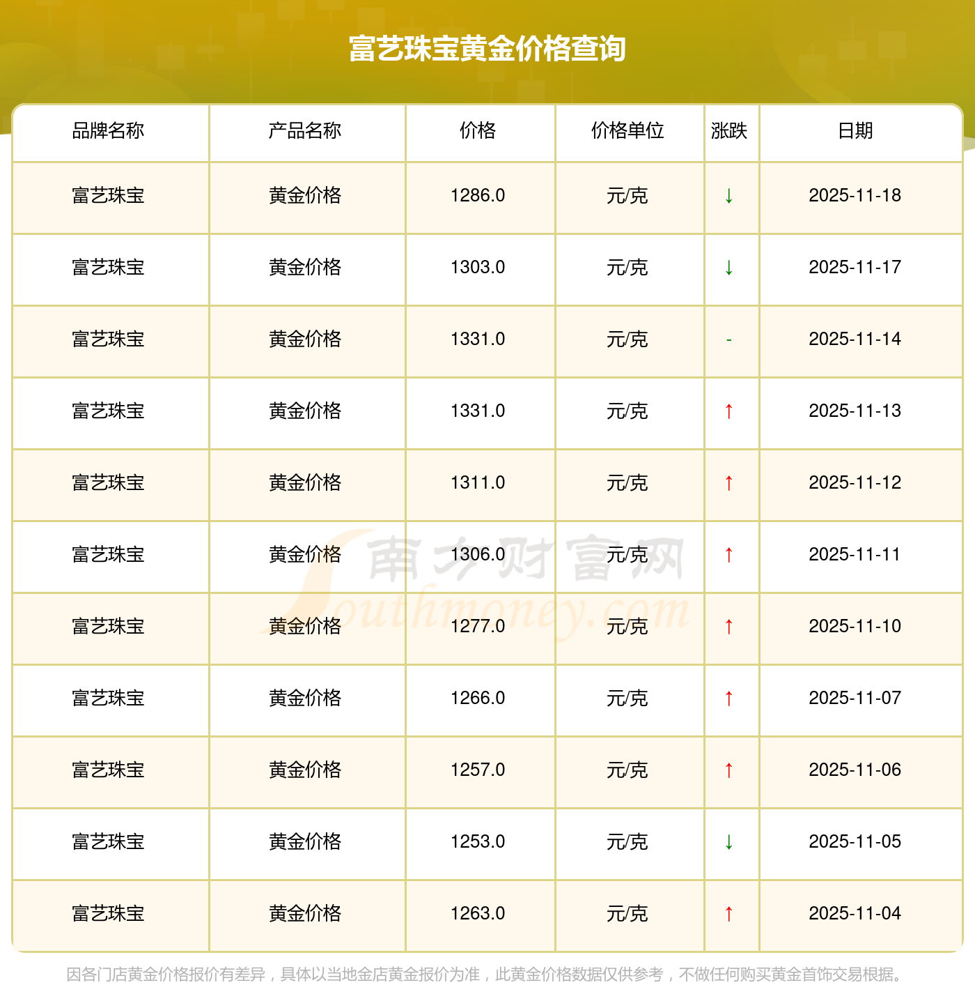 以上数据仅供参考,与当地品牌商、金店、企业及银行营业厅报价有所差异,依产品不同需另附工费,请以实际报价为准。本站对价格等不作任何保证或承诺,请自行核实相关内容,因此所引起的后果与本站无关。