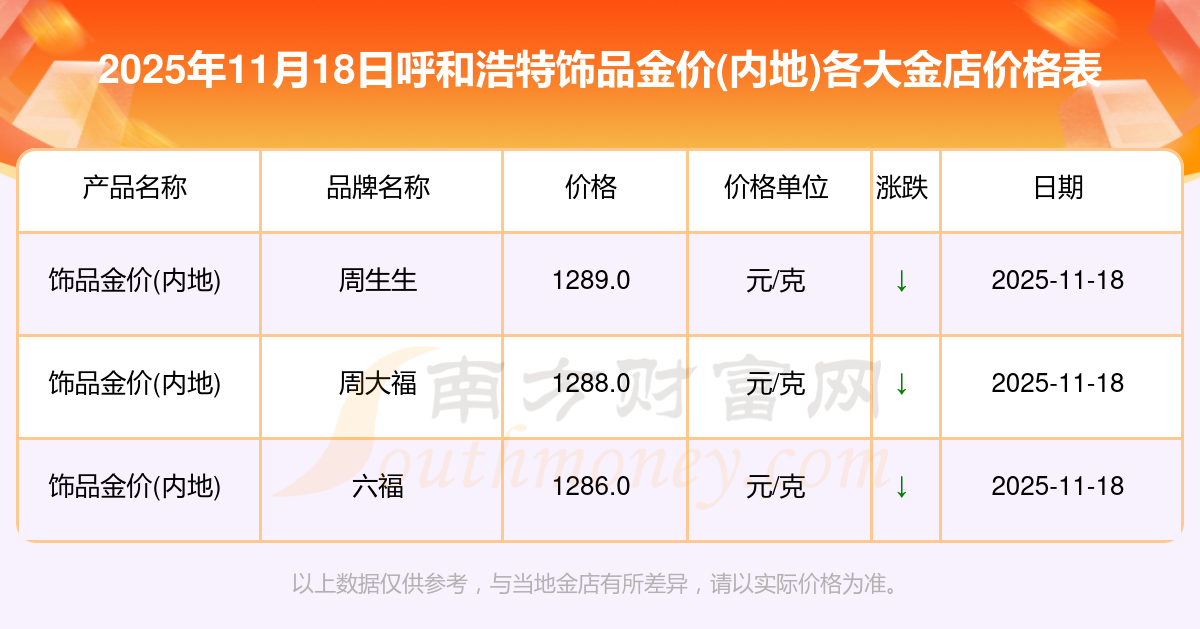 今天是2025年11月18日,呼和浩特周大福、周大福、周大福、周大福、周大福、周大福、周大福、老凤祥、老凤祥、老凤祥、周六福等各大金店品牌饰品金价(内地)最新价格如下:周大福1288.0元/克、周大福626.0元/克、周大福1288.0元/克、周大福44770.0、周大福17820.0、周大福40390.0、周大福1127.0元/克、老凤祥1285.0元/克、老凤祥600.0元/克、老凤祥1285.0元/克、周六福1257.0元/克。