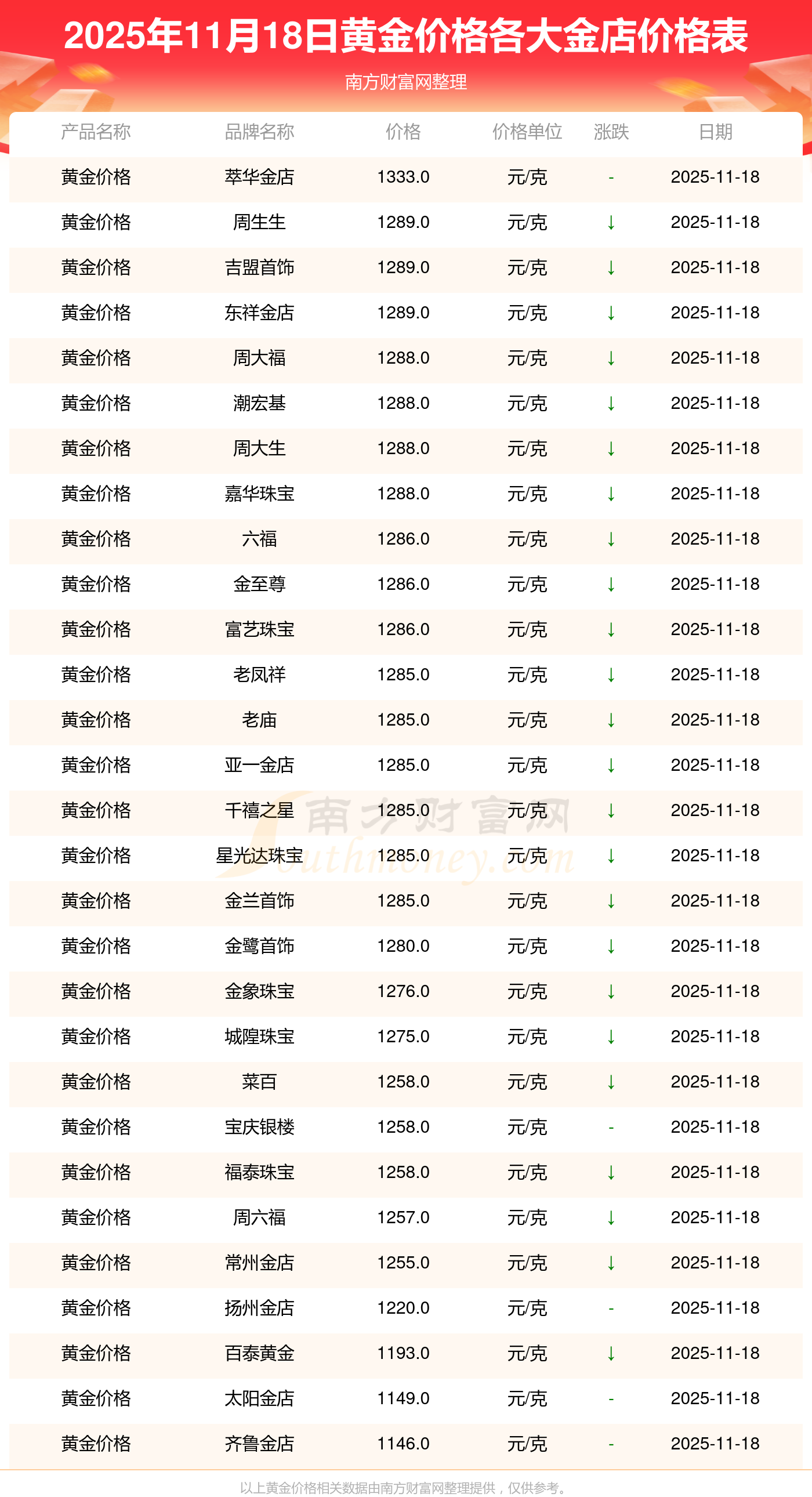 今天是2025年11月18日,周大福、周大福、周大福、周大福、周大福、周大福、周大福、老凤祥、老凤祥、老凤祥、周六福等各大金店品牌黄金价格最新价格如下:周大福1288.0元/克、周大福626.0元/克、周大福1288.0元/克、周大福44770.0、周大福17820.0、周大福40390.0、周大福1127.0元/克、老凤祥1285.0元/克、老凤祥600.0元/克、老凤祥1285.0元/克、周六福1257.0元/克。