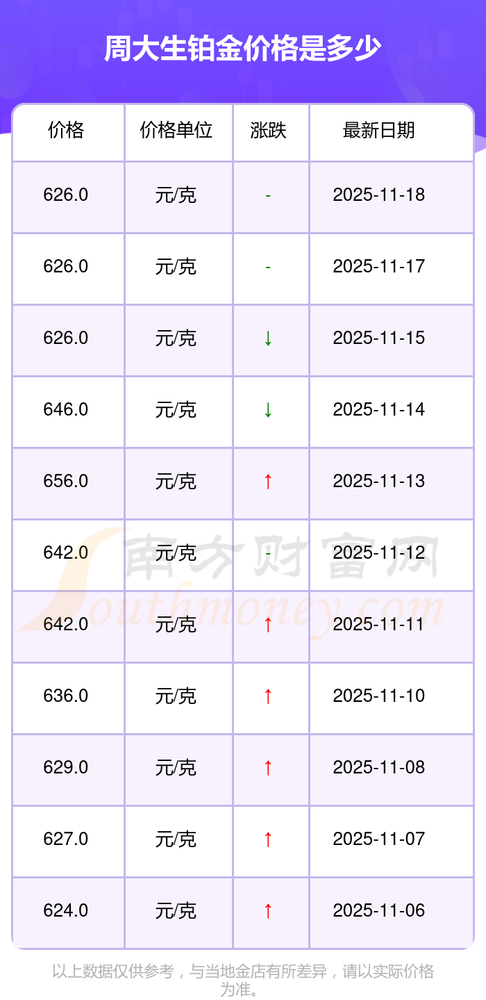 今日(2025年11月18日)周大生铂金价格是626.0元/克。
