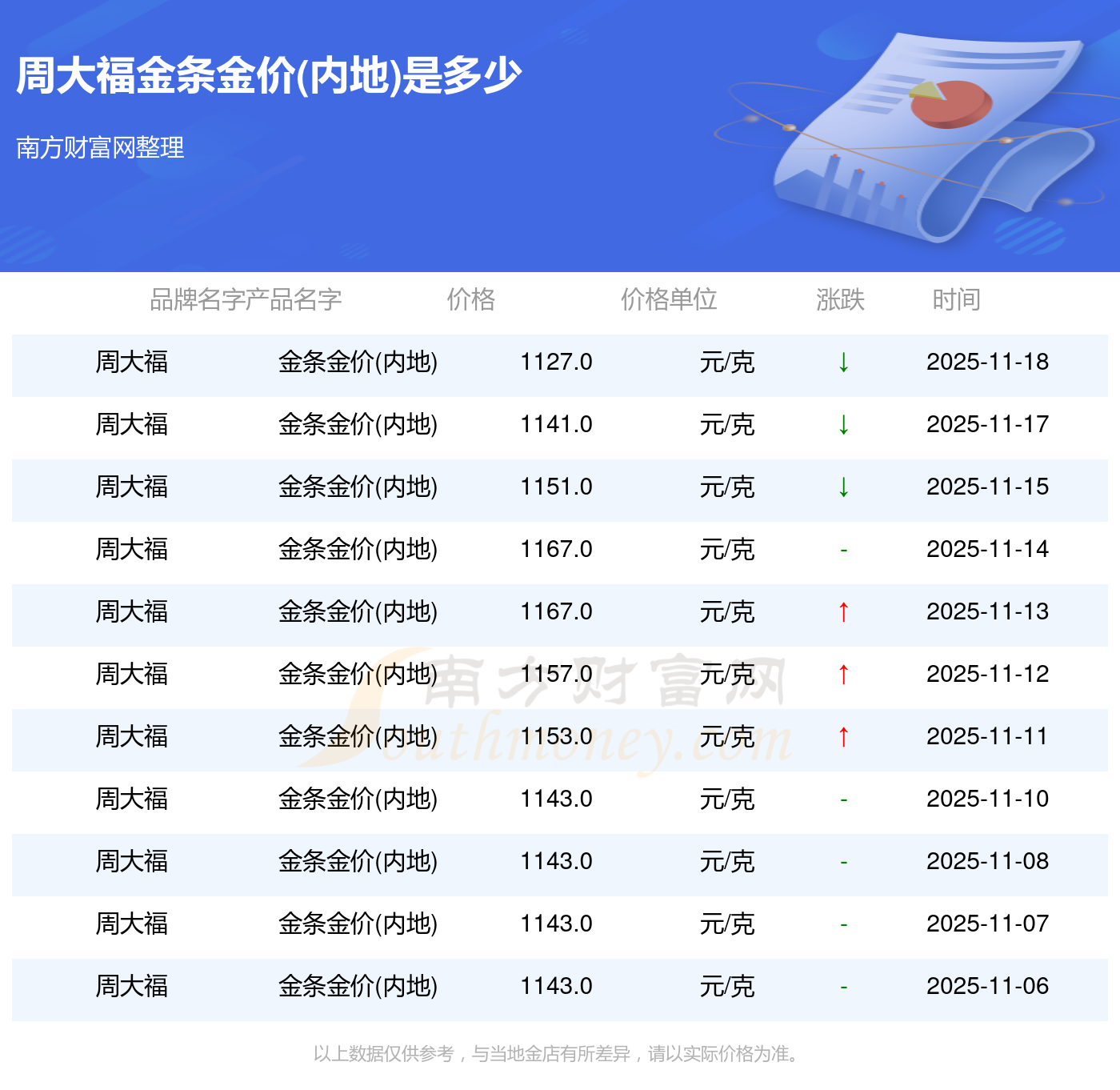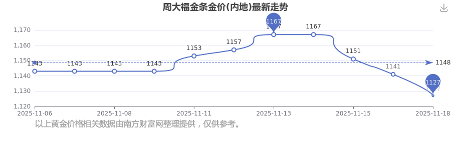 2025年11月18日周大福金条金价(内地)最新为1127.0元/克。