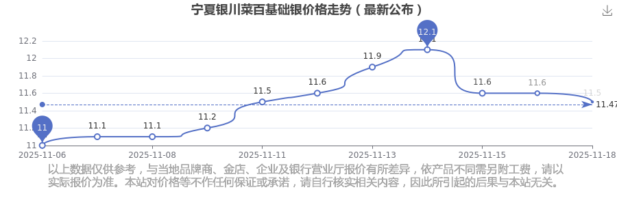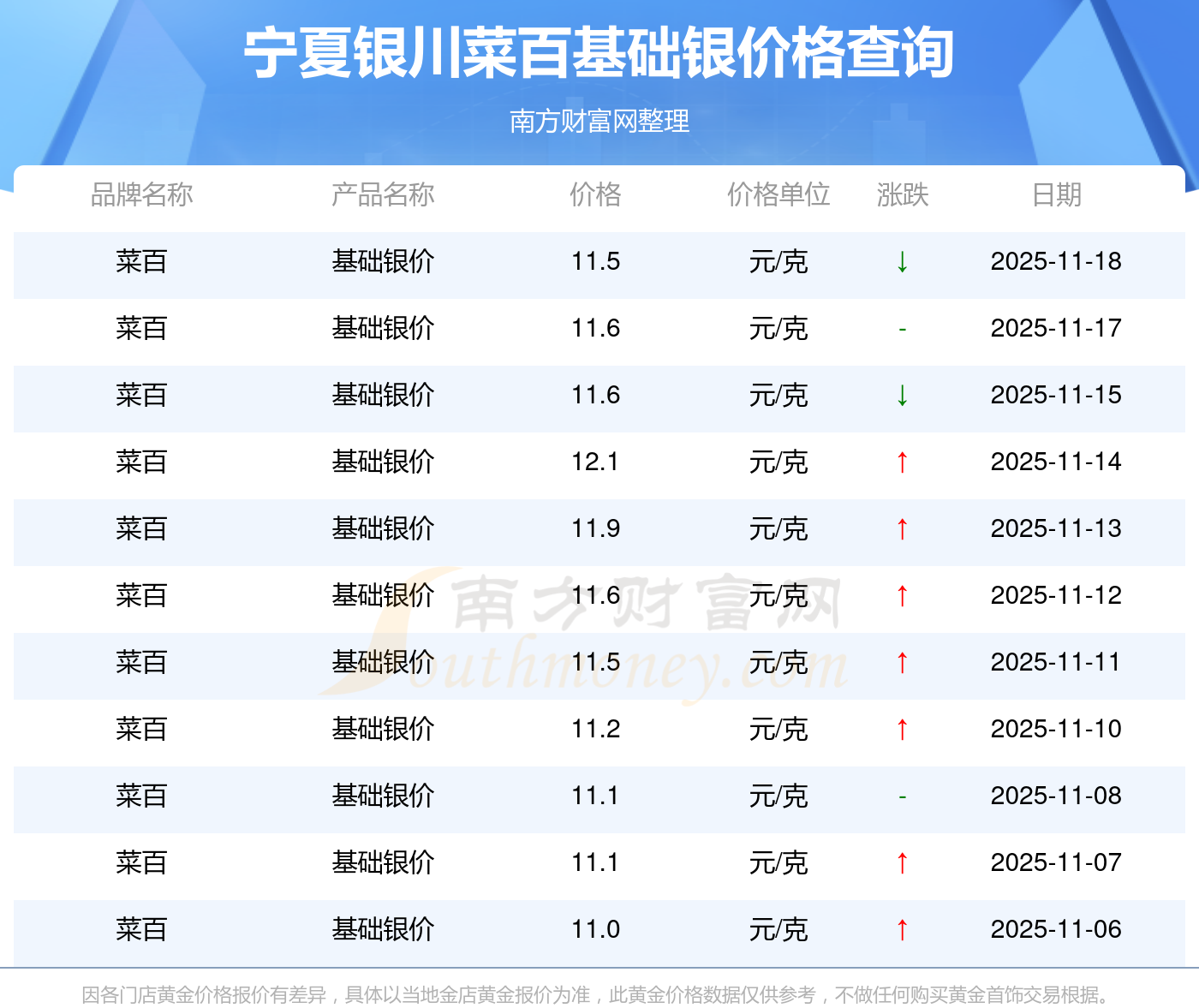 宁夏银川菜百基础银价格在 2025年11月18日为 11.5元/克。